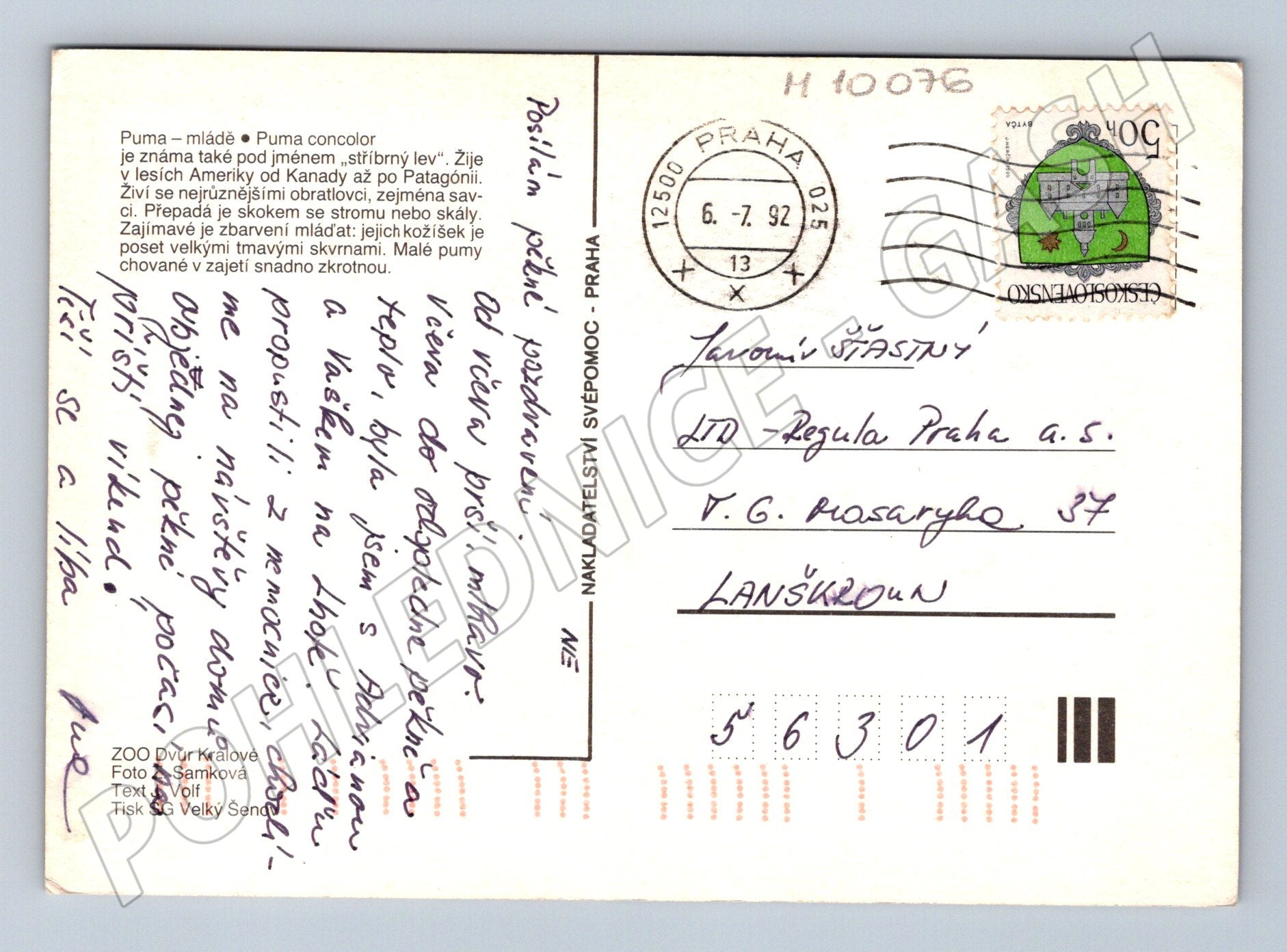 Originální pohlednice se zobrazením mláděte pumy (Puma concolor). Pohlednice byla vydána ZOO Dvůr Králové, foto E. Samková, text Volf, tisk Velký Šenov. Zajímavostí je popis na zadní straně o životě pum a jejich chování. Na pohlednici je ručně psaný vzkaz, poštovní známka a razítko z roku 1992. Pohlednice je ve velmi dobrém stavu, vhodná pro sběratele i milovníky zvířat. Formát klasický, barevná fotografie.