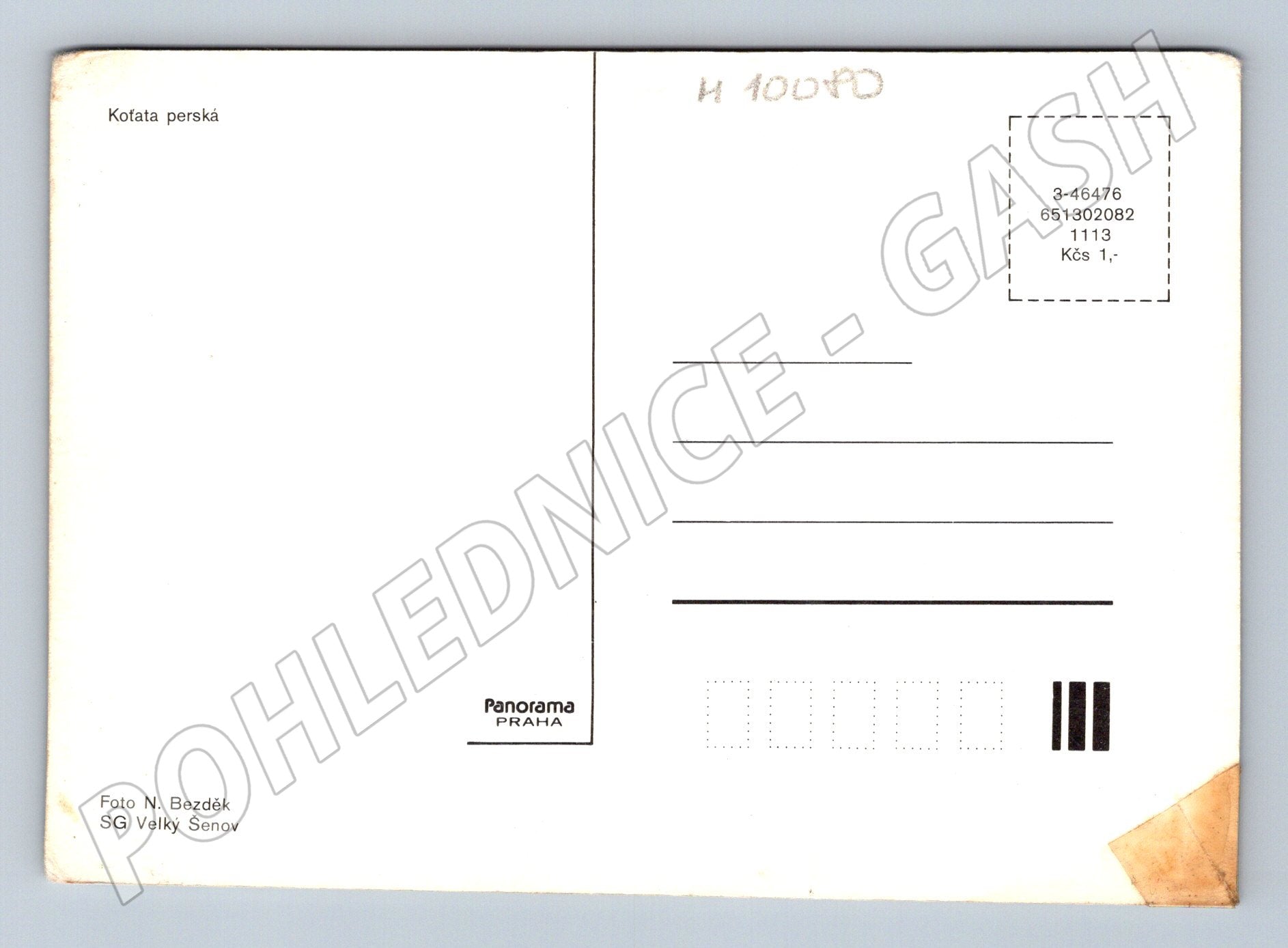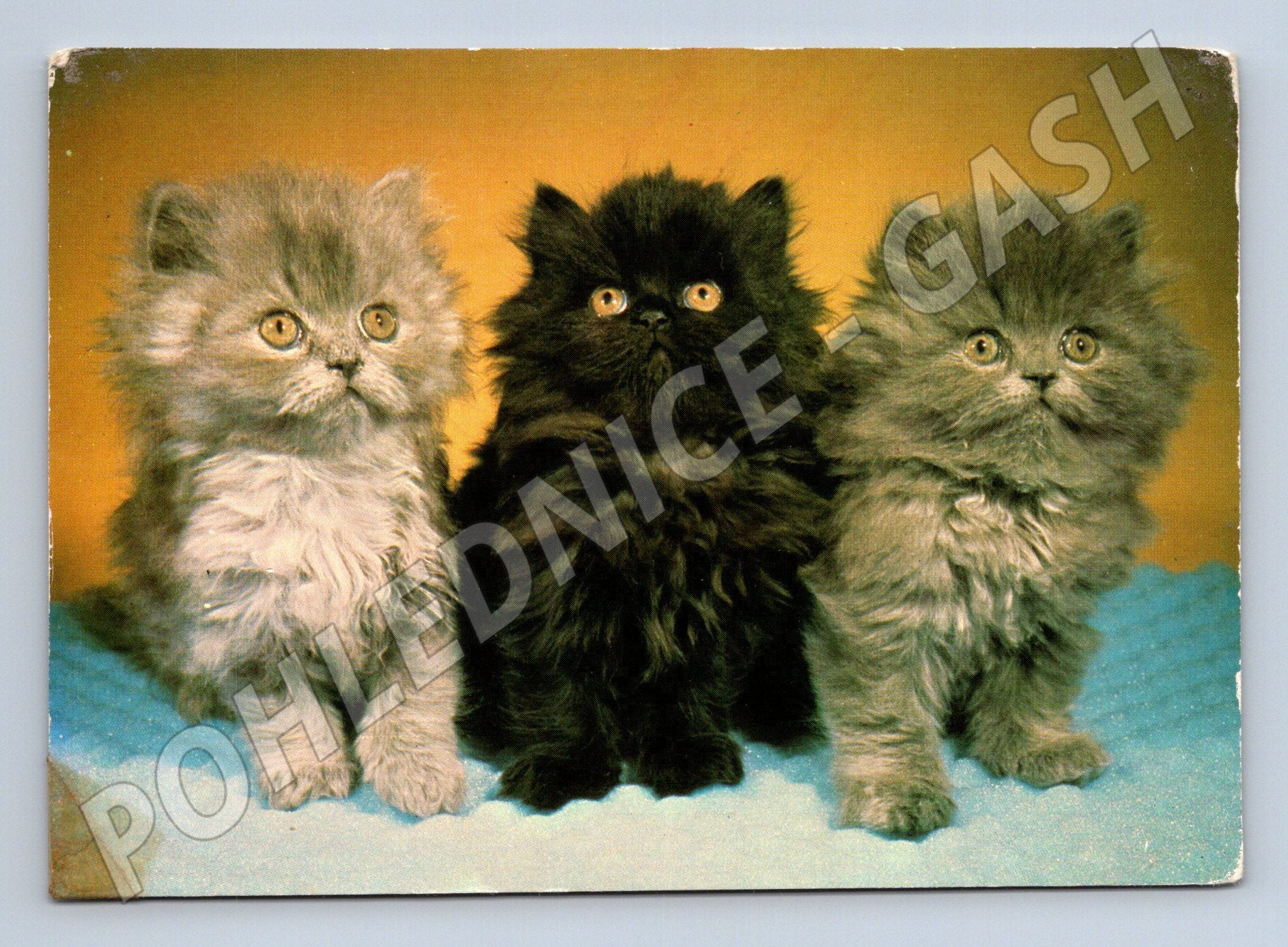 Pohlednice s motivem perských koťat, vydaná vydavatelstvím Panorama Praha. Barevná fotografie zachycuje tři roztomilá koťata na jemně barevném pozadí. Na zadní straně pohlednice je uveden popis Koťata perská , foto N. Bezděk. Vhodné pro sběratele pohlednic se zvířecí tématikou, především koček. Stav pohlednice odpovídá stáří, drobné známky opotřebení v rozích a mírné zašpinění v pravém dolním rohu zadní strany. Neprošlá poštou, bez psaného textu.