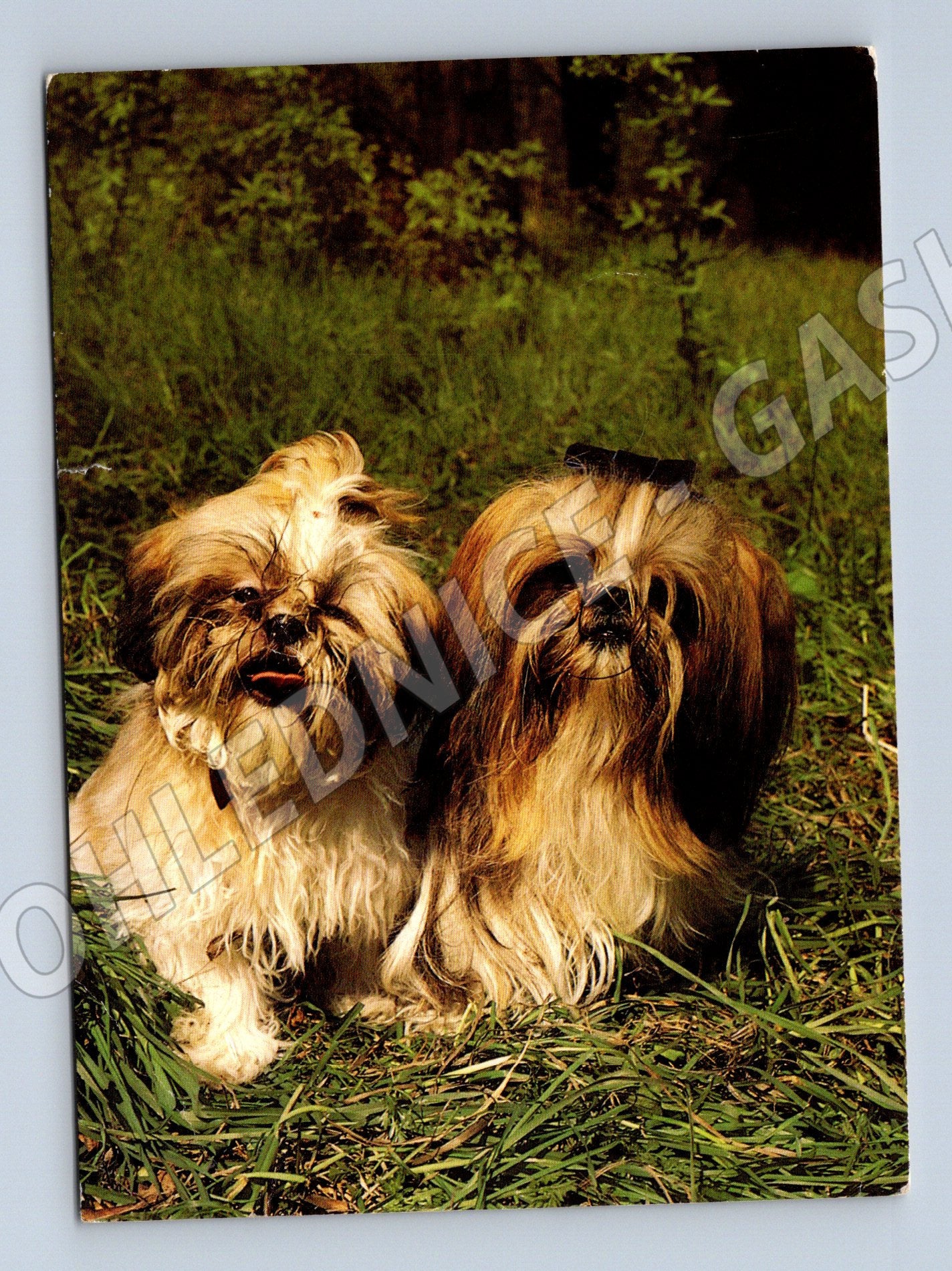 Pohlednice Ši-tzu – dva psi na trávě