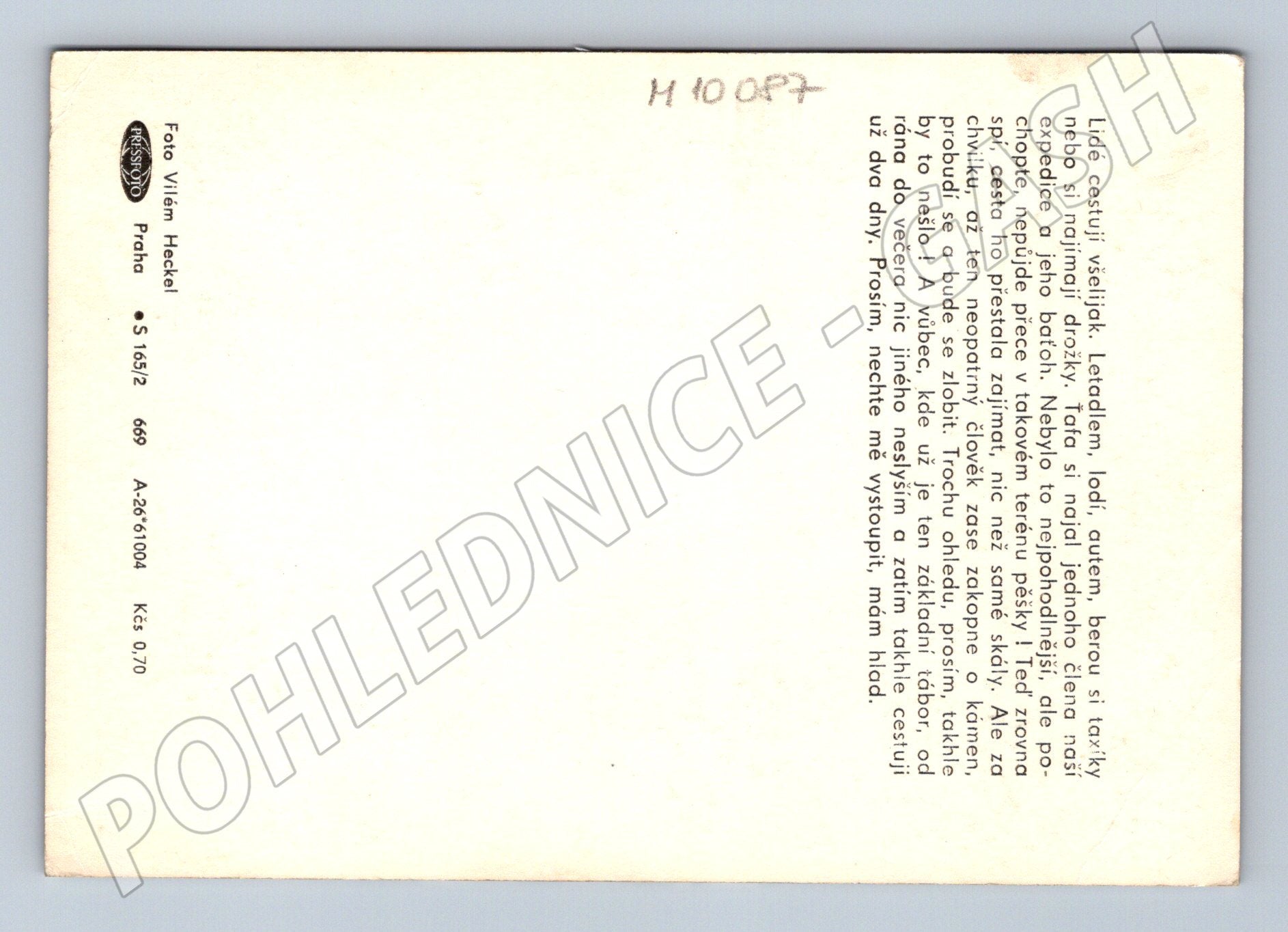 Originální pohlednice známého českého fotografa Viléma Heckela, zaměřená na horolezectví. Na černobílé fotografii jsou zachyceni horolezci při výstupu skalnatým terénem, což vyniká dramatičností okamžiku a krásou horolezeckého sportu. Na zadní straně je populárně-naučný text s nadhledem popisující zážitky z cestování, včetně humoru a osobních postřehů. Pohlednice vyšla v Československu, tisk Pressfoto Praha, katalogové číslo S 165/2, cena 0,70 Kčs. Výborný sběratelský stav, vhodné pro sběratele tematických pohlednic nebo milovníky horolezectví a fotografie.