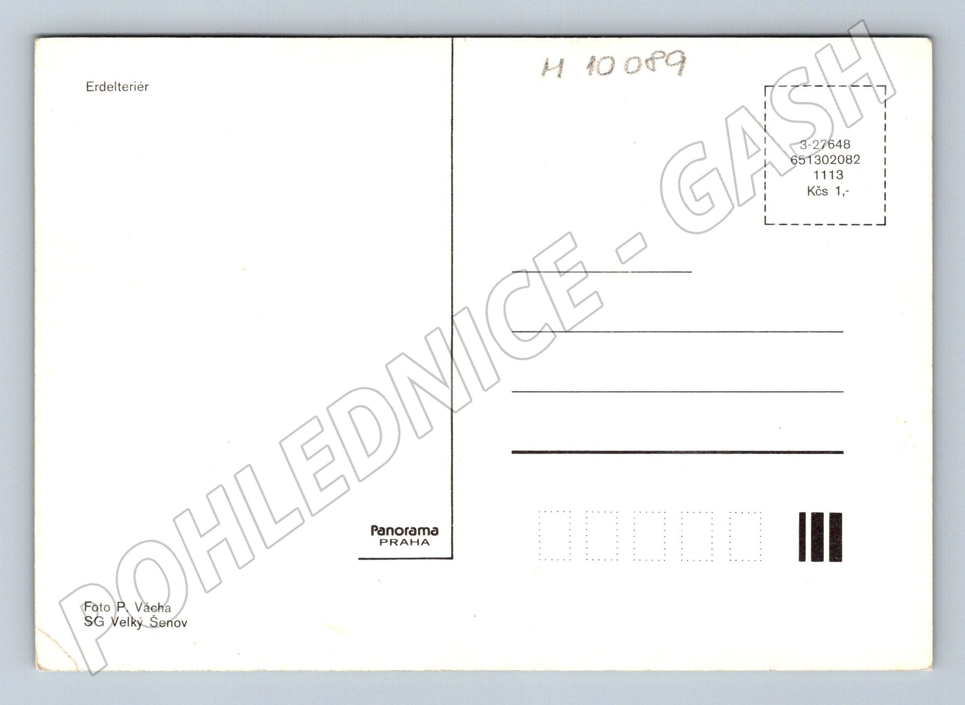 Originální pohlednice s barevným fotografickým portrétem plemene Erdelteriér (Airedale Terrier) na sytě zeleném pozadí. Zadní strana pohlednice obsahuje označení plemene, prostor pro adresu i známku, vše typické pro klasické poštovní pohlednice. Jedná se o starší vydání, vydavatel Panorama Praha, foto P. Vácha, SG Velký Šenov. Pohlednice je ve velmi dobrém stavu a ideální pro sběratele kynologických témat nebo milovníky psů.