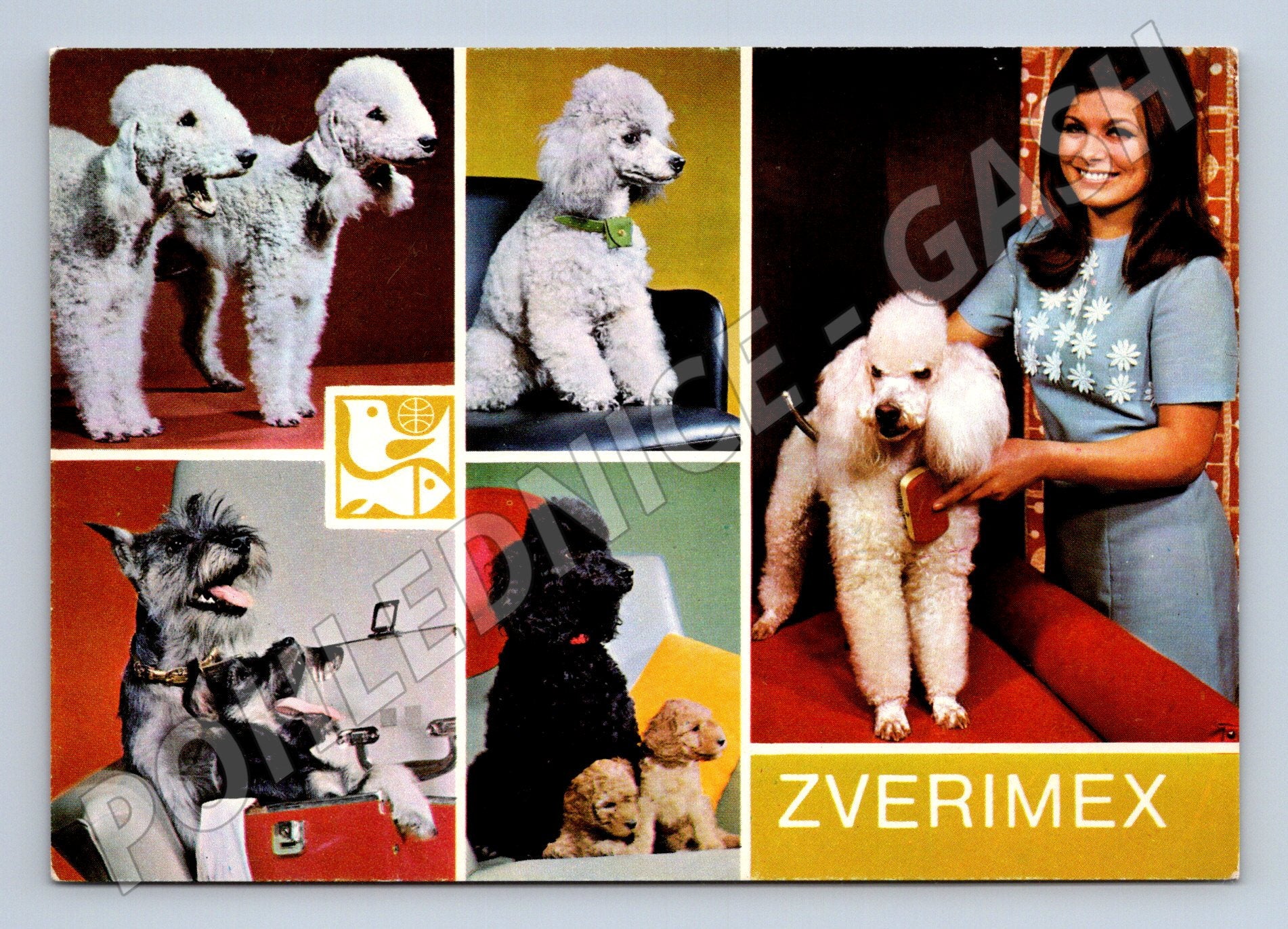 Pohlednice Zverimex – úpravna psů, Praha, retro koláž
