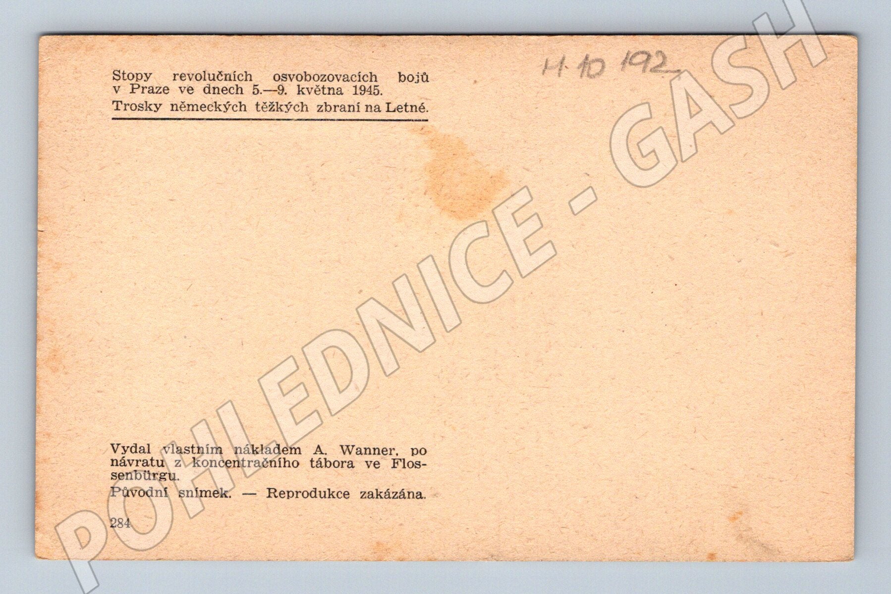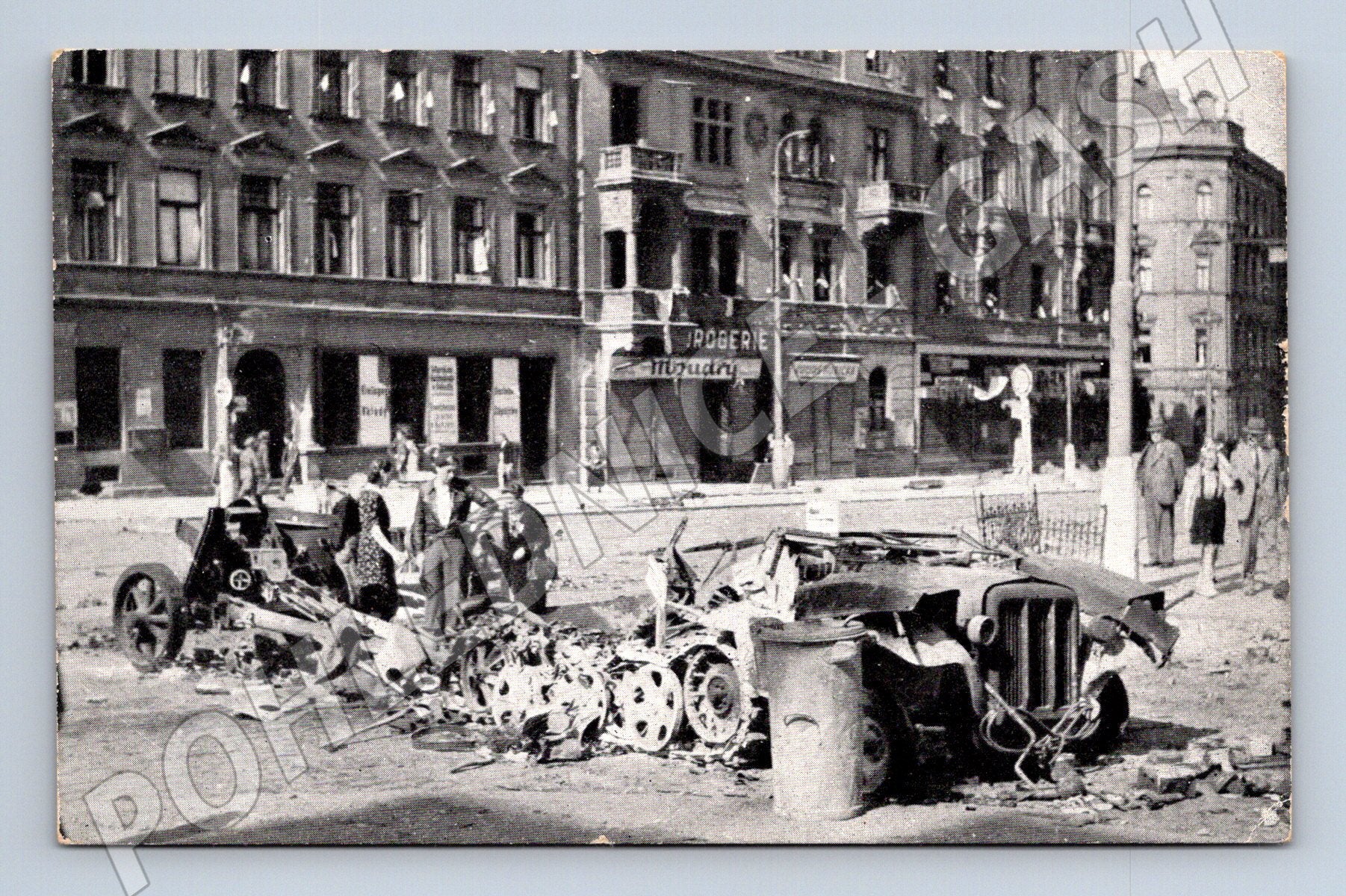 Original historical postcard documenting traces of revolutionary liberation battles in Prague from 5 to 9 May 1945. The postcard depicts the wreckage of German heavy weapons on Letná and moments from the last days of World War II in Prague. On the back is a brief description of the events including publisher's information. Published by A. Wanner after his return from the Flossenbürg concentration camp. Original photograph, an important period document for collectors and those interested in the history of World War II and the Prague Uprising.