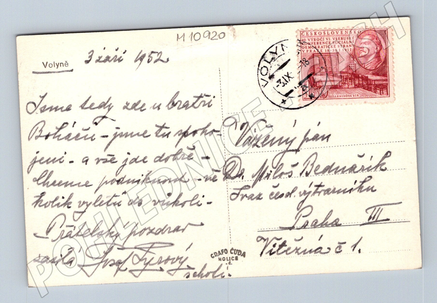 Originální pohlednice malého formátu s motivem města Volyně, zaslaná roku 1952. Na přední straně je černobílý pohled na panorama města Volyně, okolní krajinu a historické budovy. Zadní strana obsahuje ručně psaný text, známku Československo s motivem Lenina (hodnota 1,50 Kčs) a poštovní razítko Volyně. Pohlednice je v dobrém historickém stavu, vhodná do sbírky – zajímavý doklad regionální historie i původní korespondence z poválečné éry.