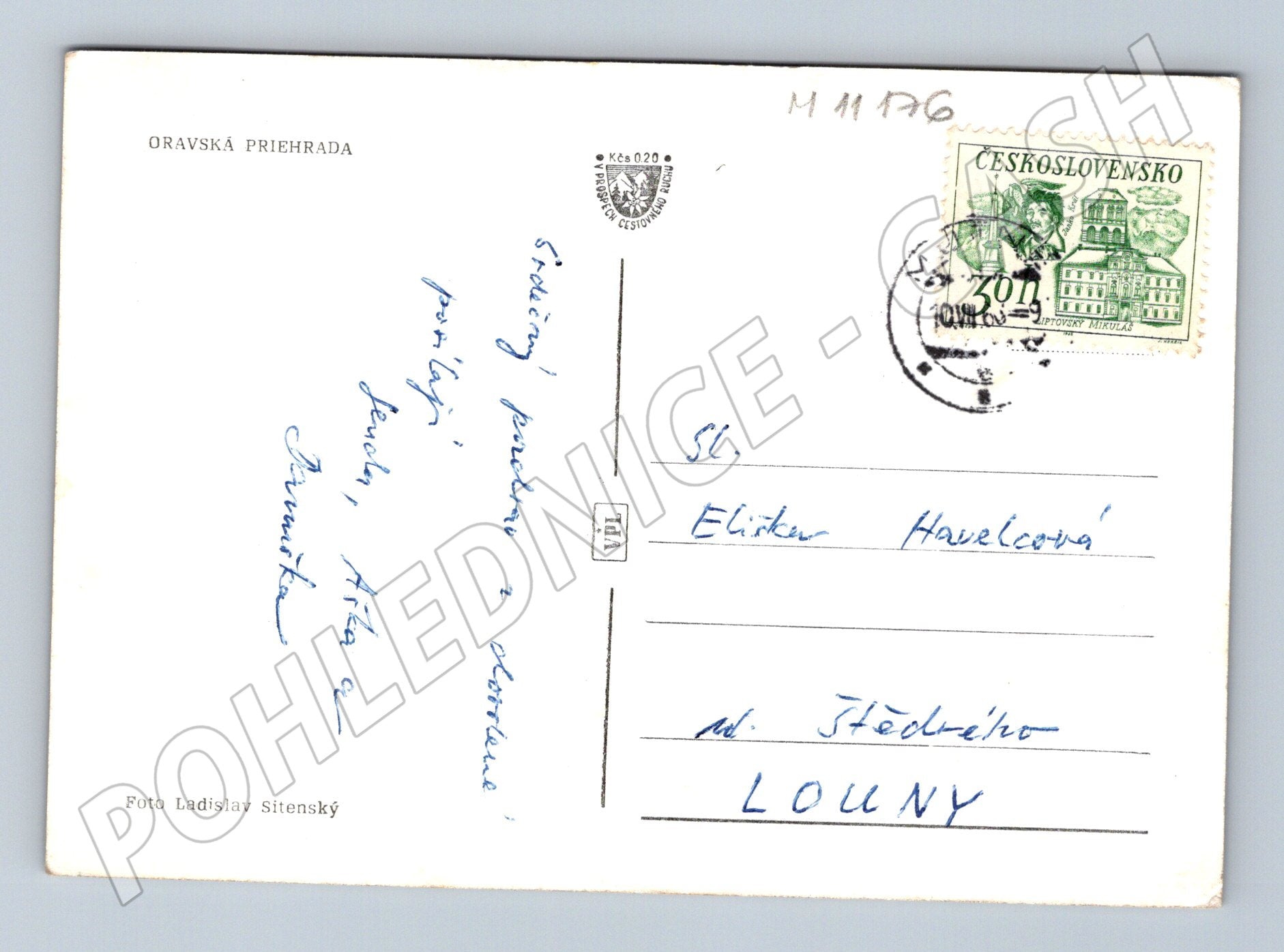 Originální stará pohlednice Oravské přehrady, na které je zachycen osobní výletní parník plující po jezeře. Na pohlednici je vidět klidná vodní hladina s lodí plnou pasažérů a malebné okolí přehrady. Zadní strana pohlednice obsahuje rukou psaný vzkaz, adresu a je opatřena známkou a razítkem z období Československa. Foto Ladislav Sitenský. Pohlednice je pěkným sběratelským kouskem, vhodná pro milovníky historie dopravy a slovenských vodních cest.