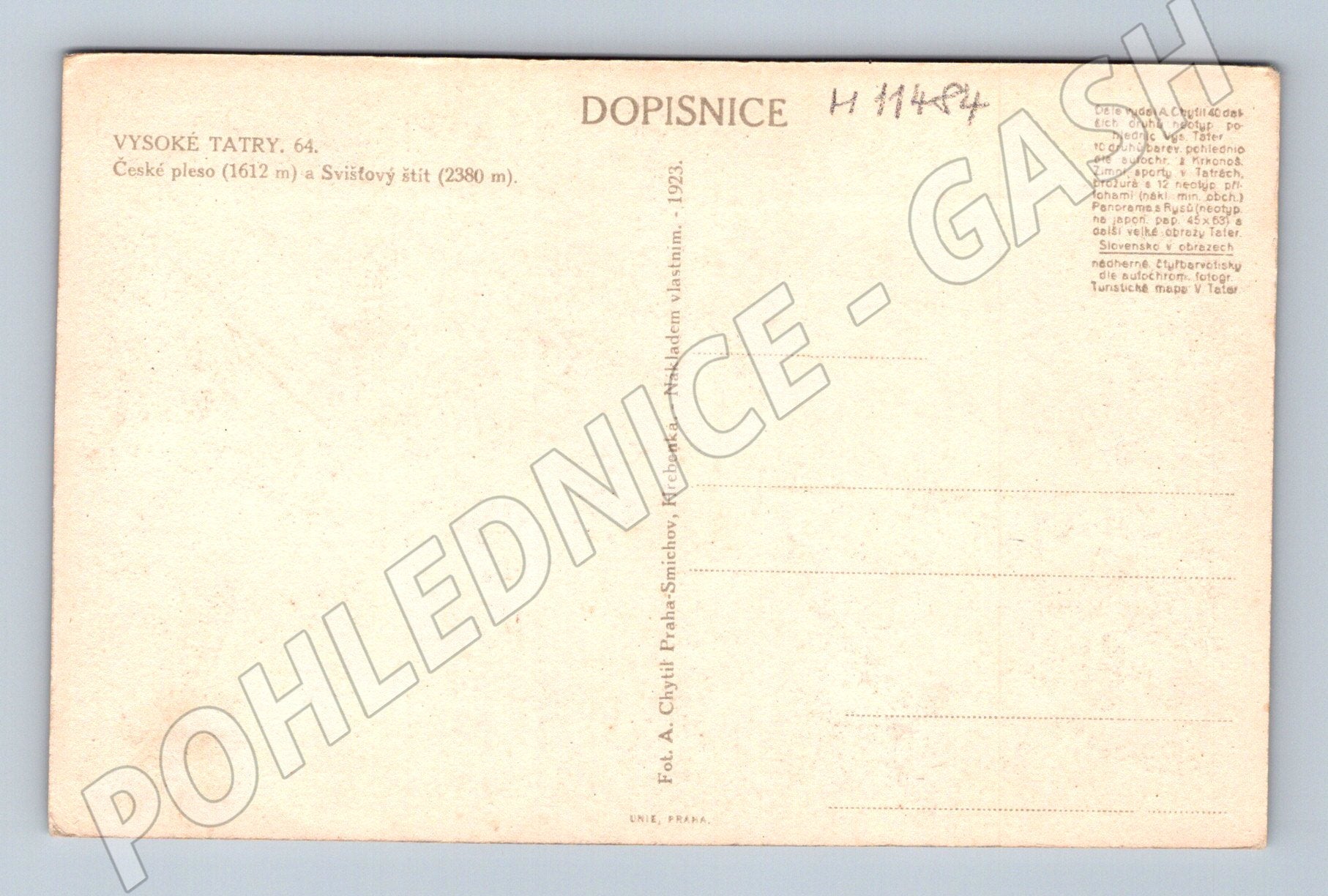 Vysoké Tatry, České pleso a Svišťový štít – pohlednice 1923