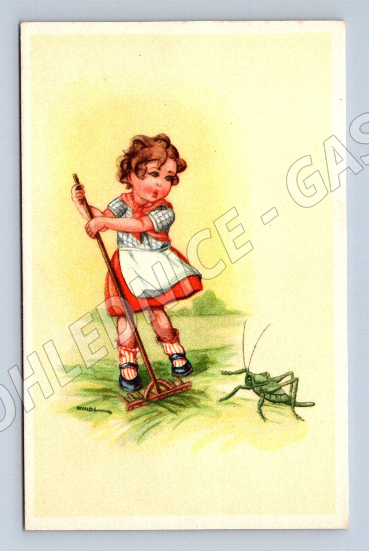 Originální stará pohlednice s barevnou ilustrací dítěte s červeným kolečkem a kobylkou/skokanem na trávě. Pohlednice není prošlá poštou a je ve velmi dobrém stavu, s minimálními známkami stáří. Rubová strana je čistá, bez zápisu, pouze s lehkým číslem tužkou. Velmi pěkná a sběratelsky zajímavá položka, vhodná do sbírky dětských nebo ilustrovaných pohlednic. Formát klasický pohlednicový, viz scan.