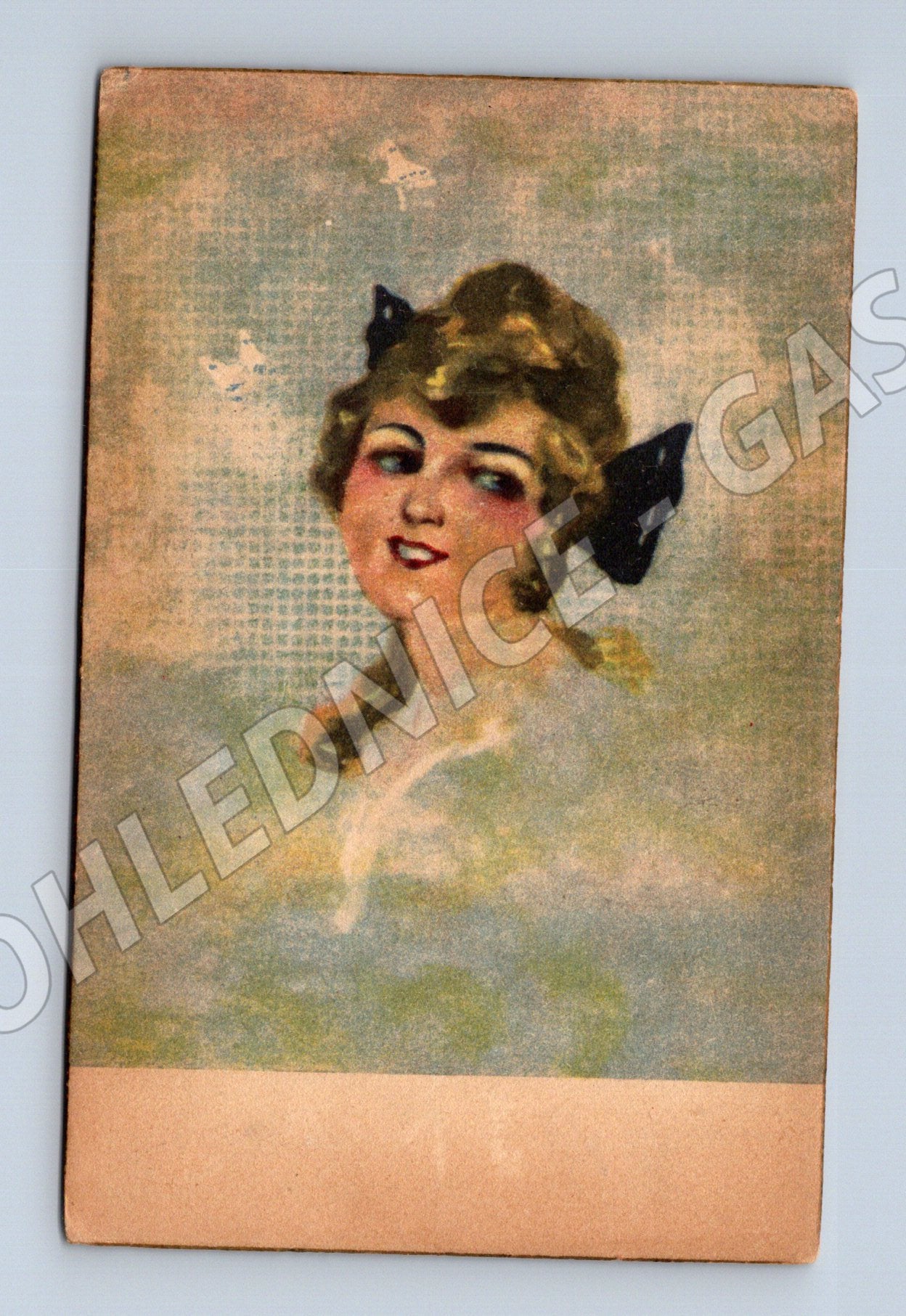 Starobylá pohlednice z období první republiky (razítko z roku 1920) zaslaná do Karlína. Na lícové straně je umělecké zpracování ženské hlavy s velkou mašlí ve vlasech v jemných pastelových barvách. Rubová strana obsahuje ručně psaný vzkaz, starou poštovní známku (ČESKOSLOVENSKO) v nominální hodnotě 15 h a adresu pana Eduarda Baráka. Pohlednice je zachovalá, s patrnými stopami stáří a drobným opotřebením po hranách. Raritní sběratelský kus vhodný do sbírek meziválečných artefaktů ČR.