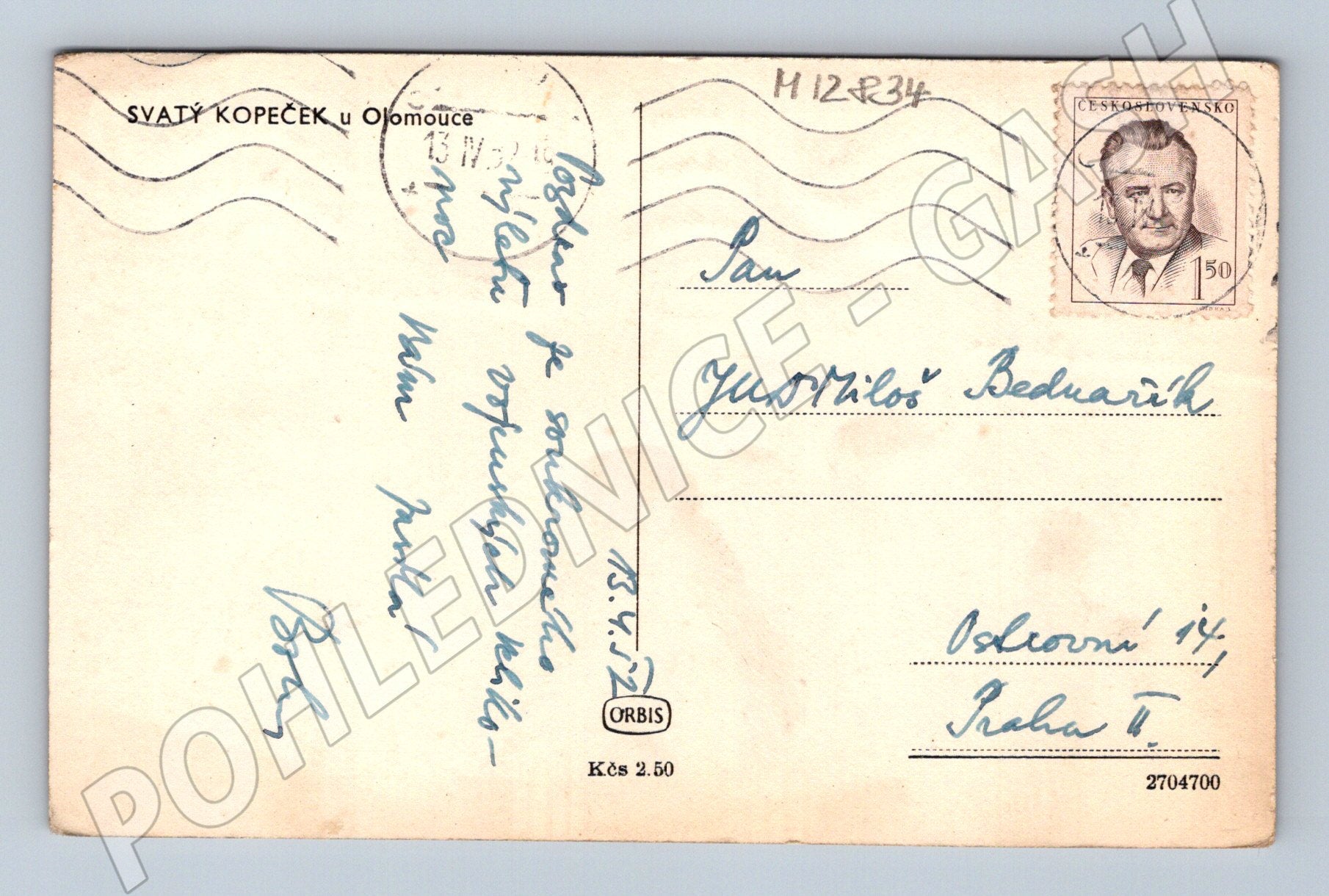 Nabízím originální starou pohlednici s motivem Baziliky Navštívení Panny Marie na Svatém Kopečku u Olomouce. Pohlednice je černobílá, zachycuje slavné poutní místo a významnou barokní památku. Na zadní straně je rukou psaný vzkaz, razítko a dobová známka z Československa. Stav pohlednice odpovídá stáří, okraje jsou mírně opotřebované. Skvělý sběratelský kousek nebo jako připomínka české historie a architektury.