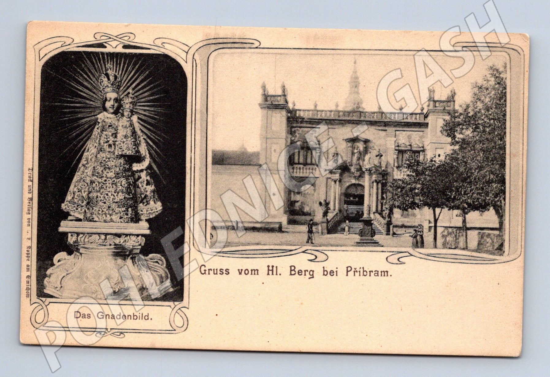 Starobylá pohlednice z období před rokem 1950. Na přední straně se nachází vyobrazení slavného poutního místa Svatá Hora u Příbrami – vlevo je soška Panny Marie Svatohorské (Das Gnadenbild), vpravo pak pohled na komplex budov a hlavní schodiště s poutníky. Pohlednice je ve velmi dobrém stavu, s minimálními stopami opotřebení vzhledem ke svému stáří. Zadní strana nenese žádné známky použití ani zápisu. Ideální sběratelský kousek pro milovníky historických pohlednic a českých památek.