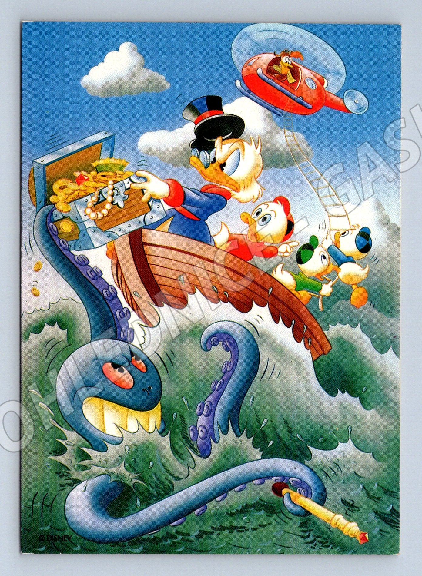 Nabízím sběratelskou pohlednici s motivem postav z prostředí Disney – Kačer Donald, jeho synovci a další známí hrdinové. Pohlednice je krásně barevná, neprošlá poštou, ve výborném stavu (viz foto). Na přední straně je legrační ilustrace s pokladem, chobotnicí a dobrodružnou scénou. Zadní strana je čistá, bez popisu. Skvělá do sbírky pro milovníky Disney a komiksových postav! Vhodné i jako dárek.