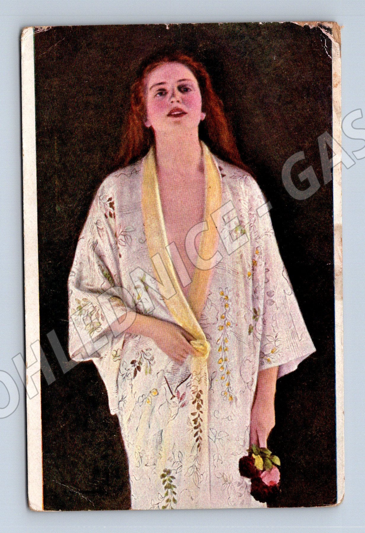 Starší sběratelská pohlednice s reprodukcí obrazu Maxe Nonnenbrucha s názvem Mimo svět (Traumverloren / Hors du monde). Na pohlednici je vyobrazena mladá žena v květovaném rouchu s květinou v ruce, v jemných pastelových barvách na tmavém pozadí. Pohlednice má znatelné známky stáří a opotřebení, hlavně v rozích a na hranách, viz sken. Zadní strana je nepopsaná, s označením Salon J.P.P. 1062 a vydavatelem J. Plichta, Praha. Vhodné pro sběratele pohlednic a milovníky umění přelomu 19. a 20. století.