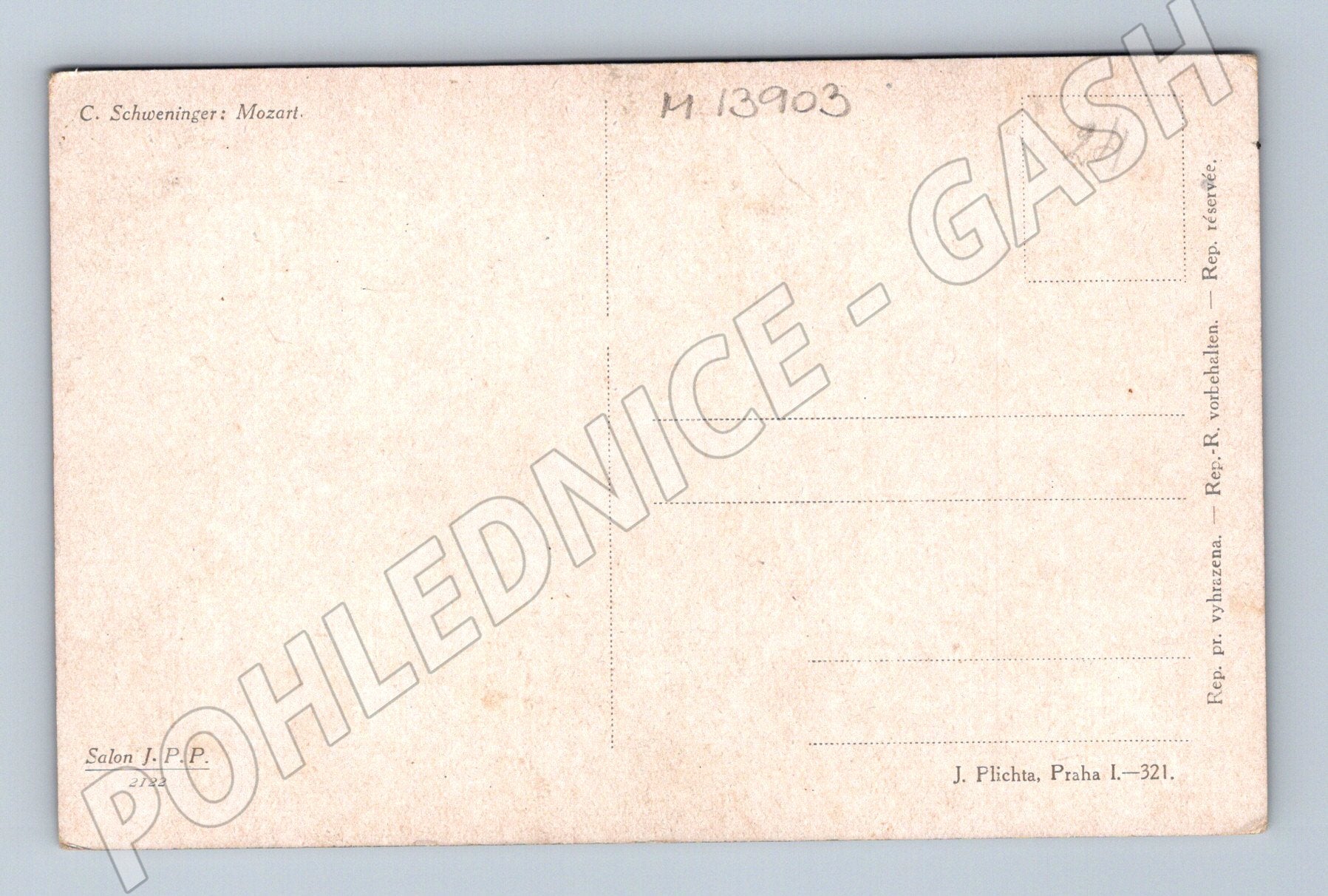 Nabízím starou pohlednici s motivem Wolfganga Amadea Mozarta, jak ho zobrazil malíř C. Schweninger. Pohlednice zachycuje slavného skladatele v jeho pracovně u klavíru, v pozadí je vidět okno s výhledem na krajinu a hrad. Na zadní straně je uvedeno C. Schweninger: Mozart . Pohlednice neprošla poštou a je ve velmi dobrém sběratelském stavu, jen drobné stopy po manipulaci. Vydal J. Plichta, Praha, Salon J. P. P. č. 2122. Ideální přírůstek do sbírky hudebních či osobnostních pohlednic.