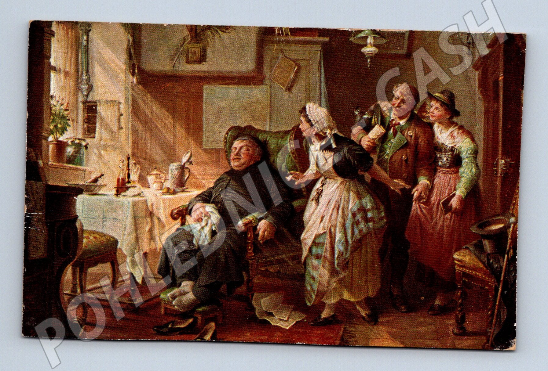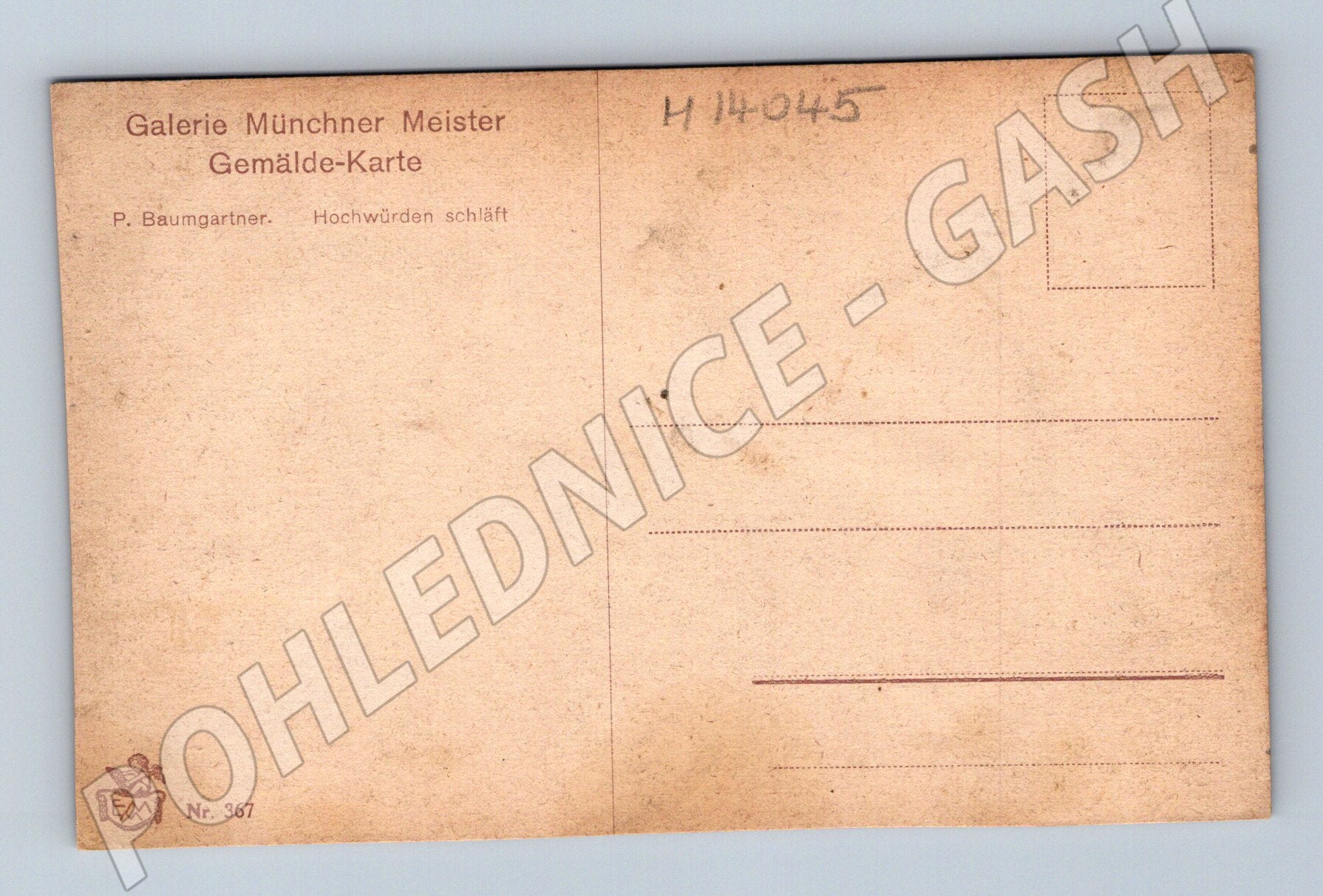 Starší pohlednice z edice Galerie Münchner Meister - Gemälde-Karte s názvem Hochwürden schläft od malíře P. Baumgartnera. Přední strana zobrazuje žánrovou scénu odpočívajícího duchovního, kolem nějž stojí několik postav v dobovém oblečení. Na zadní straně je tisk s údaji o vydavateli a místo pro adresu a známku. Pohlednice je ve slušném stavu, s drobnými známkami opotřebení na hranách. Vhodné pro sběratele malířských pohlednic nebo milovníky historických žánrových scén.