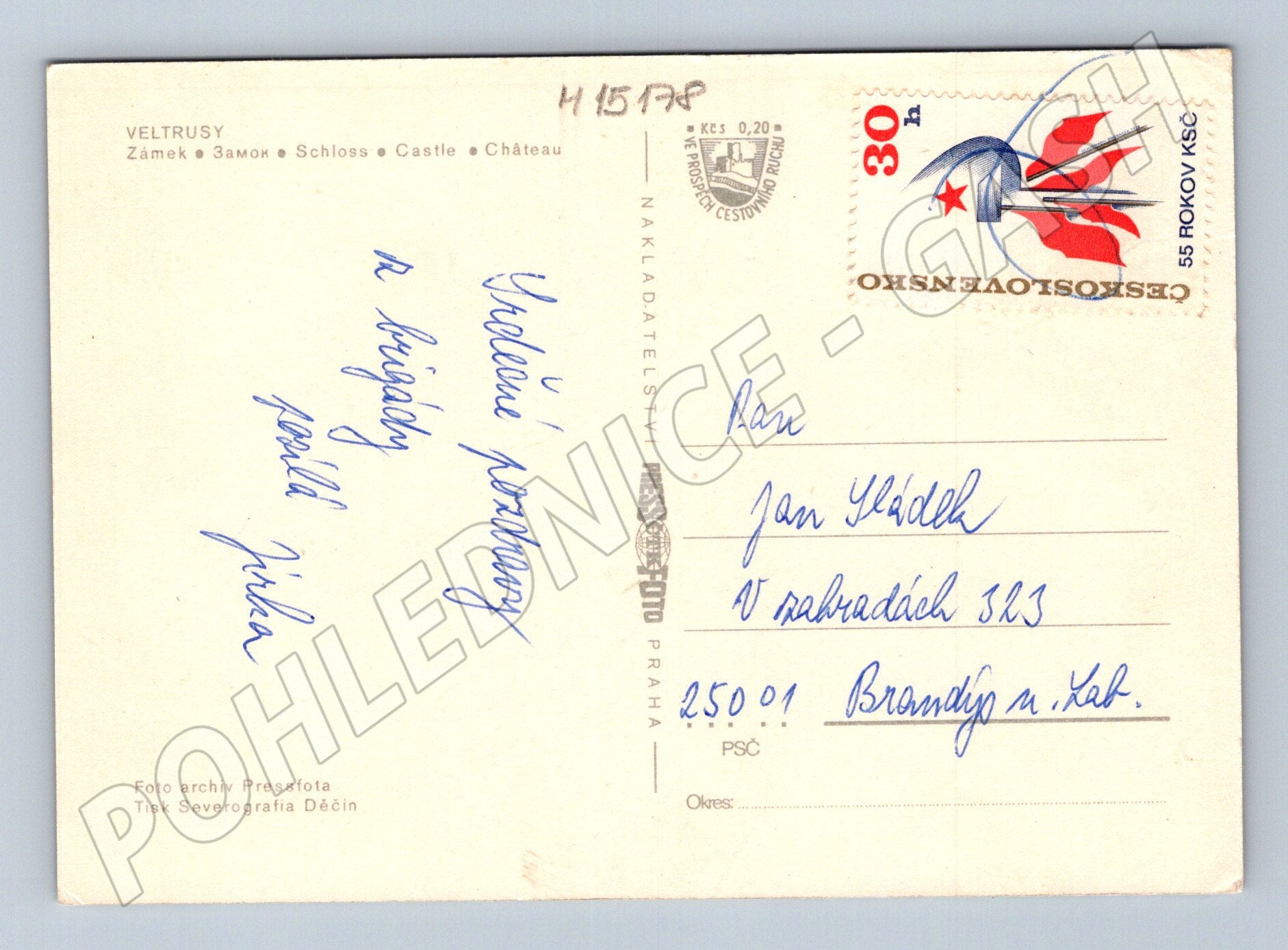 Originální pohlednice zámku Veltrusy, která zachycuje slavnou klasicistní stavbu s krásně upravenou zahradou. Pohlednice byla zaslána a opatřena dobovou známkou (Československo, 30 h, 55 let KSČ) i poštovním razítkem. Na zadní straně je ručně psaný pozdrav, adresována do Brandýsa nad Labem. Jedná se o pohlednici malého formátu z období Československa, vydanou nakladatelstvím Pressfoto Praha, tisk Severografia Děčín. Stav viz foto, sběratelsky atraktivní kus vhodný do sbírky historických pohlednic zámků.