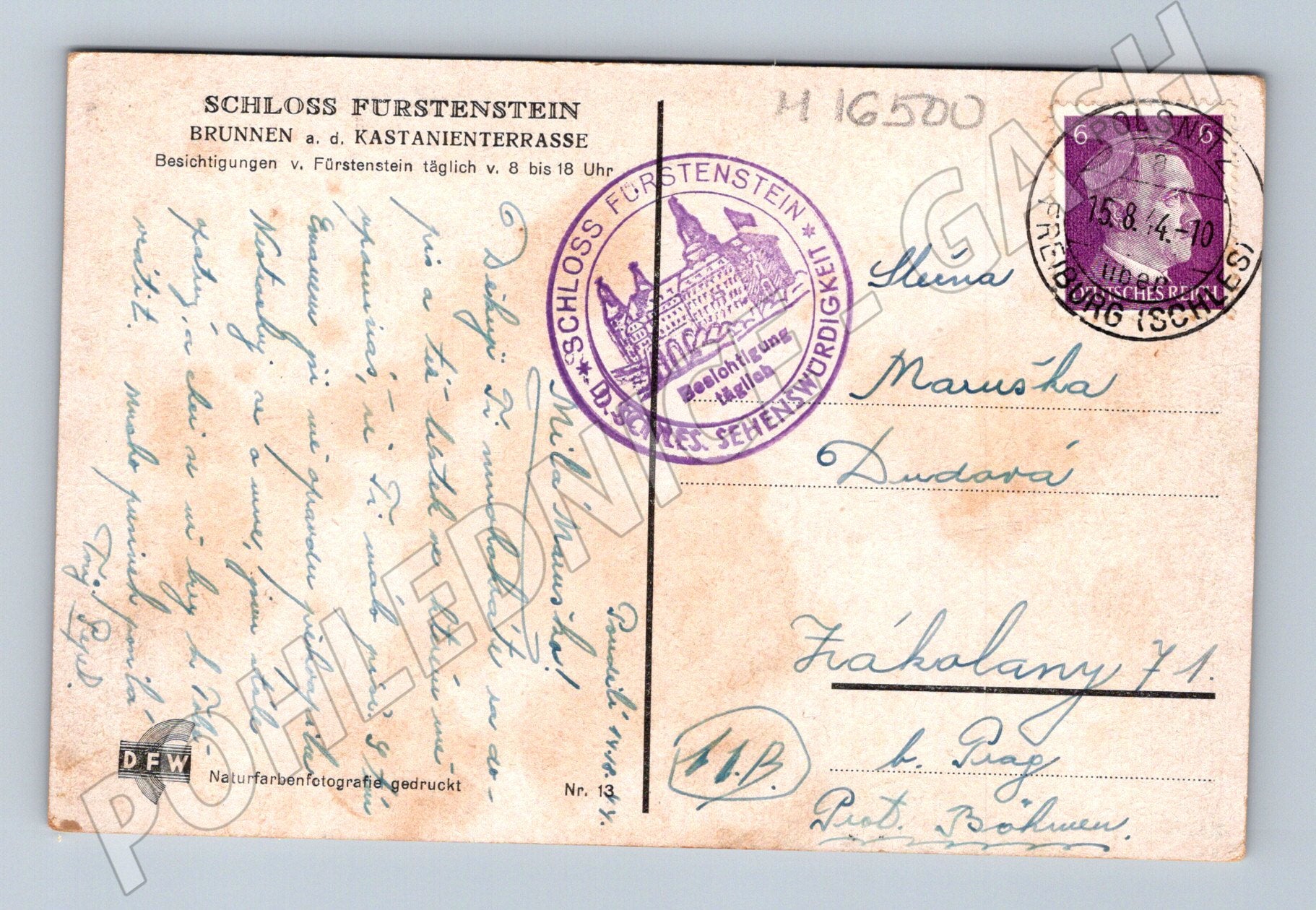Pohlednice zachycuje kašnu na terase u zámku Fürstenstein (dnes Zamek Książ) v Polsku. Na přední straně je barevná fotografie krásné barokní kašny s množstvím sošek a propracovaných detailů. Zadní strana je popsaná, se známkou a razítkem z roku 1940. Dále obsahuje adresu do Prahy v tehdejším Protektorátu Čechy a Morava. Pohlednice je tištěna technikou naturfarbenfotografie (barevná fotografie), vydavatel DFW. Velmi pěkný sběratelský stav, původní historická celistvost i s poštovním razítkem a známkou. Ideální pro sběratele historických pohlednic nebo zájemce o polské památky.