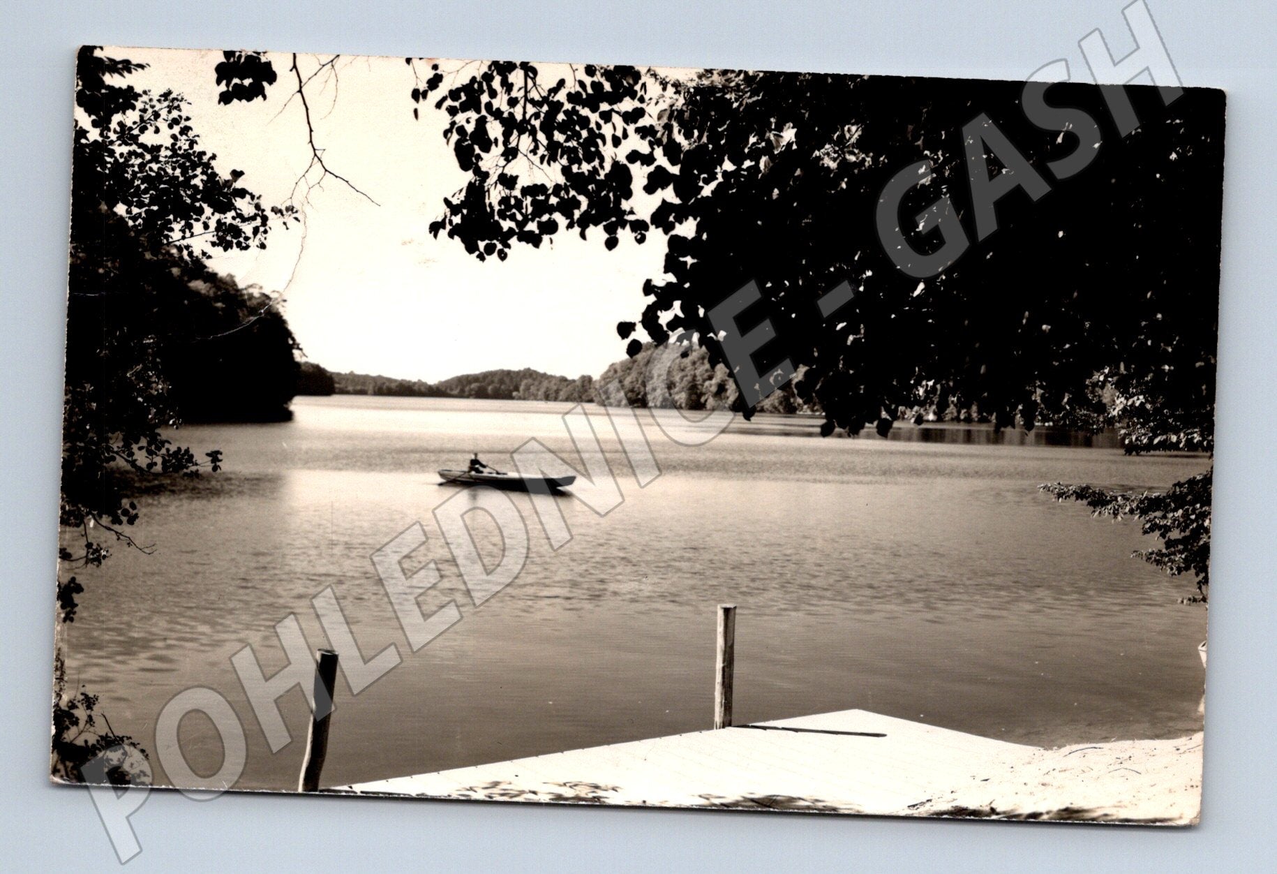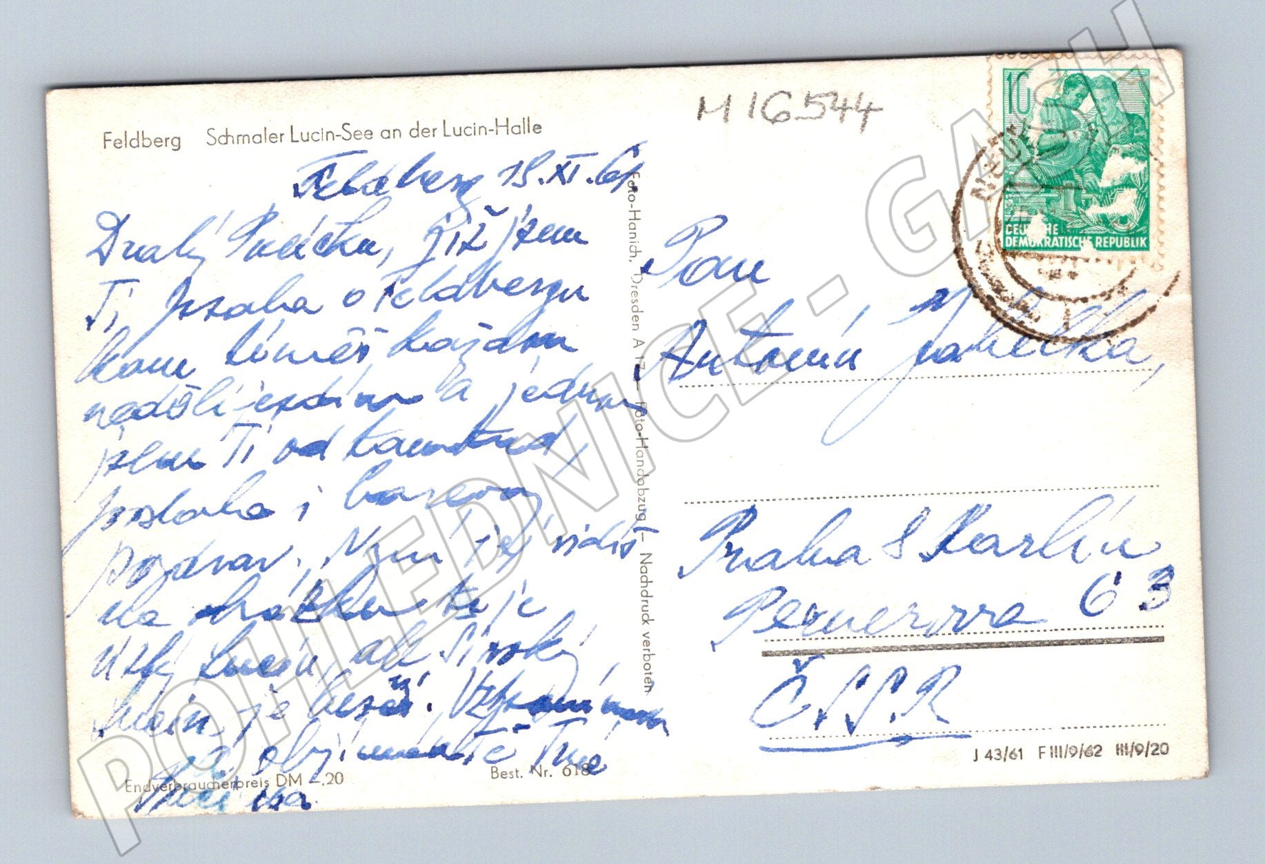 Černobílá pohlednice znázorňuje klidnou jezerní scénu s loďkou u mola, obklopenou přírodou a stromy. Na zadní straně je ručně psaný text, poštovní známka NDR a adresát v Praze. Tato pohlednice byla odeslána z Feldbergu a zachycuje typickou rekreační atmosféru východoněmeckých jezer. Jedná se o hezký sběratelský kus pro milovníky vodní dopravy a pohlednic se scénami přírody a lodí. Stav dle scanů, známky používání, kolkovaná známka. Vhodné do tematické sbírky vodních ploch, vodní rekreace nebo poštovní historie.
