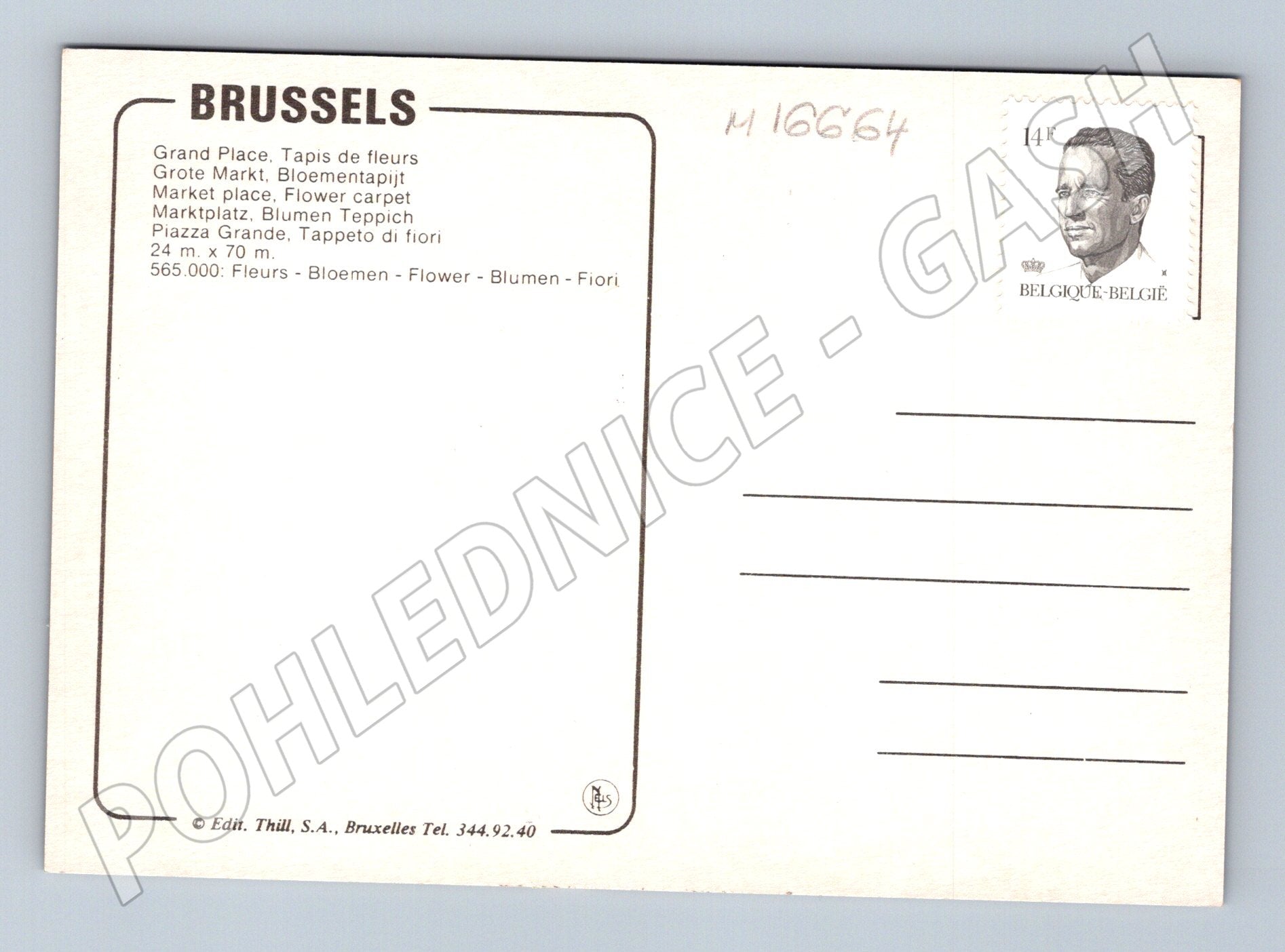 Originální pohlednice z Bruselu (Brussels) s motivem slavného náměstí Grand Place během tradiční akce Květinový koberec (Flower Carpet / Tapis de fleurs / Blumen Teppich). Barevná pohlednice zachycuje noční atmosféru náměstí ozdobeného květinami. Na zadní straně naleznete podrobný popis v několika jazycích (francouzsky, nizozemsky, anglicky, německy, italsky). Nepsaná, čistá, se známkou 14F Belgique-België s portrétem. Velmi pěkný kousek pro sběratele tematických zahraničních pohlednic nebo milovníky Belgie a Bruselu. Rozměr cca 15 x 10,5 cm. Vydavatel: Edit. Thill, S.A., Bruxelles.