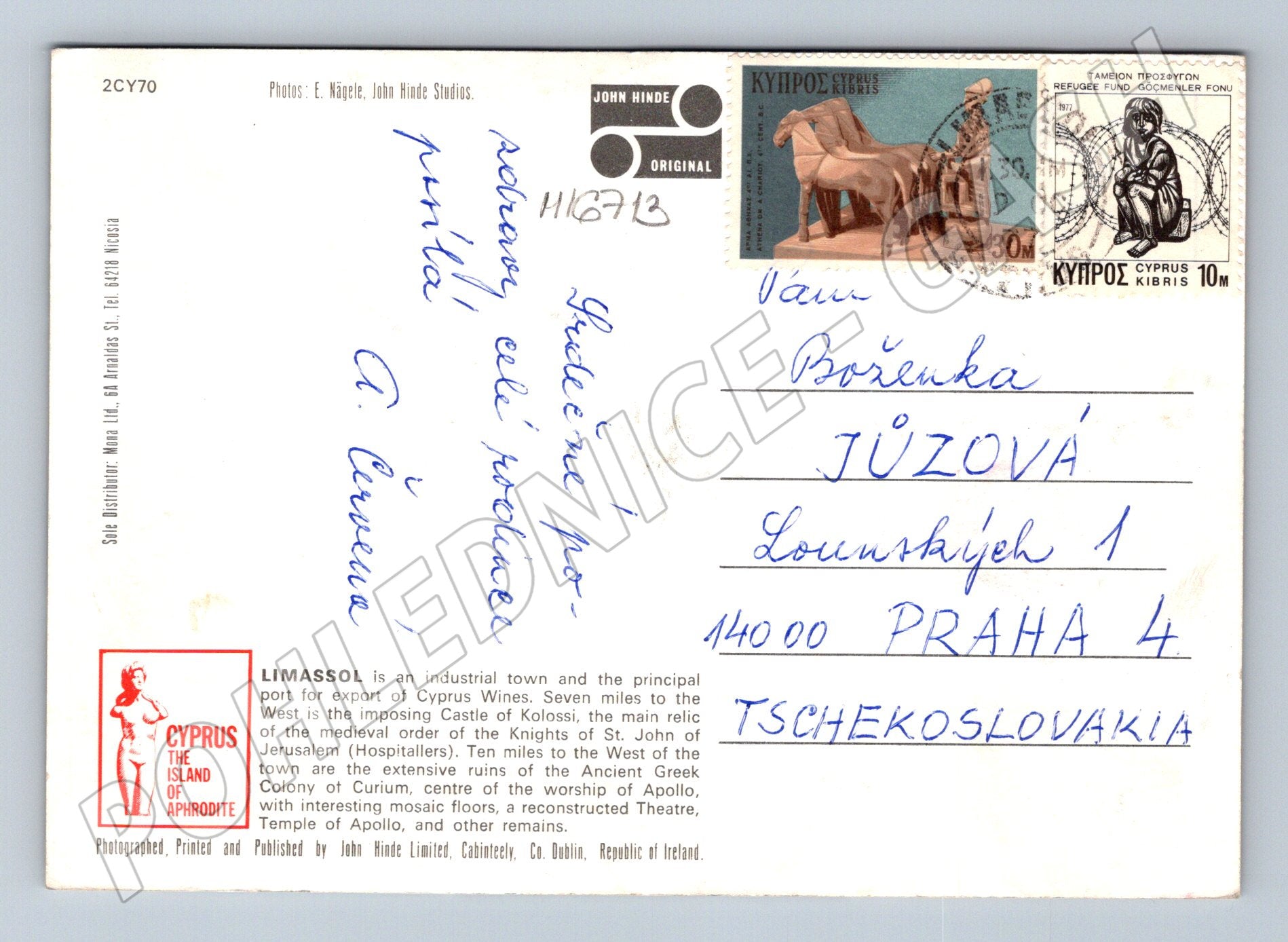 Originální pohlednice z Kypru – Limassol (Lemesos) s více fotkami pamětihodností oblasti. Na přední straně jsou zobrazeny slavné starověké ruiny, mozaiky, sochy, amfiteátr a přístav v Limassolu. Nechybí ani západ slunce nad mořem a významné památky jako hrad Kolossi. Pohlednice je poslaná, se známkami a rukopisným textem. Vhodné pro sběratele pohlednic, milovníky historie a cestování či jako retro dekorace. Výborný stav odpovídající stáří, razítkované známky z Kypru z roku 1980. Rozměr klasický.