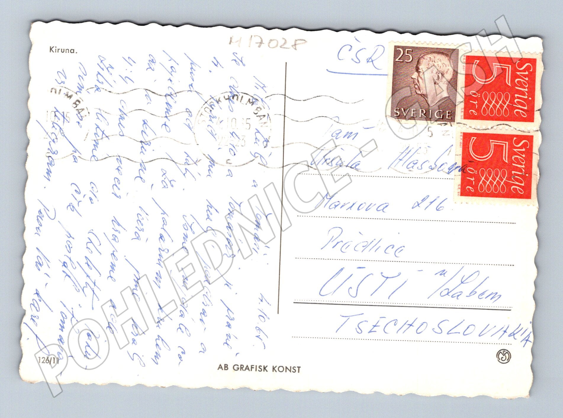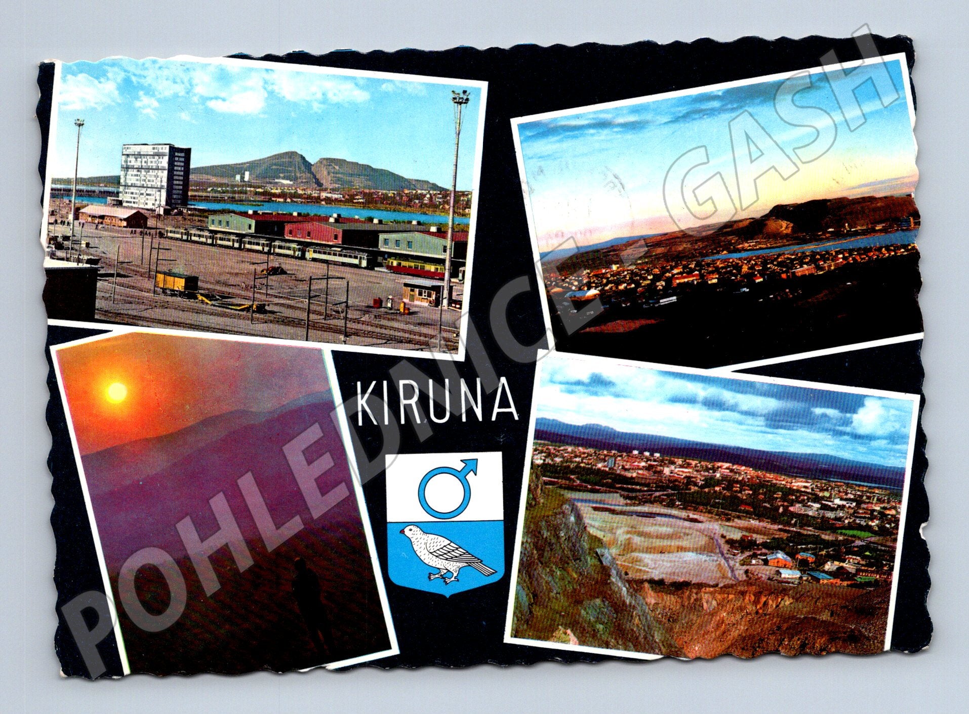 Originální pohlednice ze švédského města Kiruna. Na přední straně jsou koláže fotografií zobrazující průmyslové zóny, město Kiruna a přírodní scenérie v okolí. Na zadní straně je rukopisná zpráva z roku 1970 a razítka s poštovními známkami ze Švédska s hodnotou 25 öre a dvěma známkami po 5 öre. Adresováno do bývalého Československa. Pohlednice nese známky používání, rohy jsou mírně opotřebované, vhodná pro sběratele evropských pohlednic nebo sběratele zaměřené na Skandinávii a švédská města.