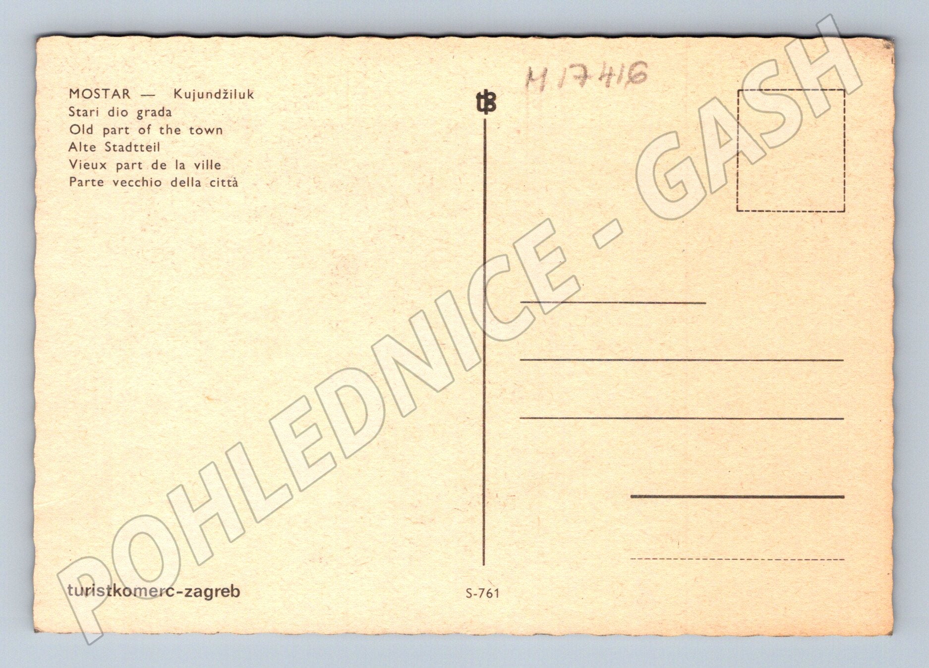 Originální pohlednice znázorňující starou část města Mostar (Kujundžiluk). Na lícní straně je zachyceno rušné tržiště s množstvím měděných výrobků, tradiční architekturou a minaretem v pozadí. Na zadní straně pohlednice je vícejazyčný popis: Stari dio grada / Old part of the town / Alte Stadtteil / Vieux part de la ville / Parte vecchio della città . Vydavatel: Turistkomerc-Zagreb. Pohlednice nebyla použita, velmi dobrý sběratelský stav. Skvělý tip pro milovníky historických měst a balkánské atmosféry.