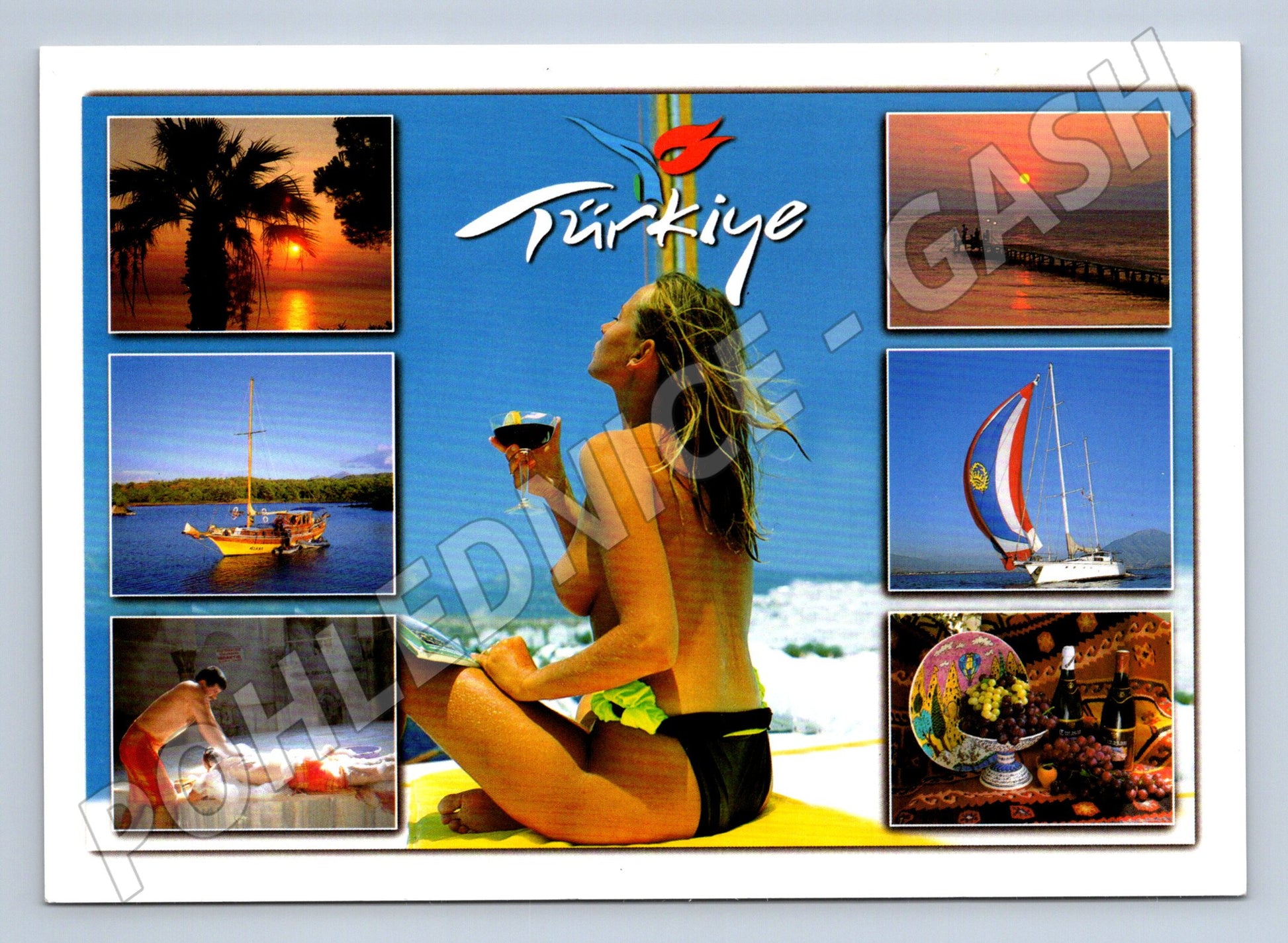 Originální turistická pohlednice z Turecka s nápisem Türkiye . Pohlednice je barevná s několika fotografiemi z přímořské dovolené, včetně západu slunce s palmami, plachetnic, odpočívajících lidí u moře, tradičních tureckých pokrmů a relaxace na pláži. Na hlavním obrázku sedí žena na pláži se sklenkou vína v ruce a užívá si výhled na moře. Zadní strana je nepopsaná, v pravém rohu je číselné označení 151/144 a kód výrobce. Pohlednice je vhodná jako suvenýr, dárek nebo přírůstek do sbírky cestovatelských pohlednic. Výborný stav.