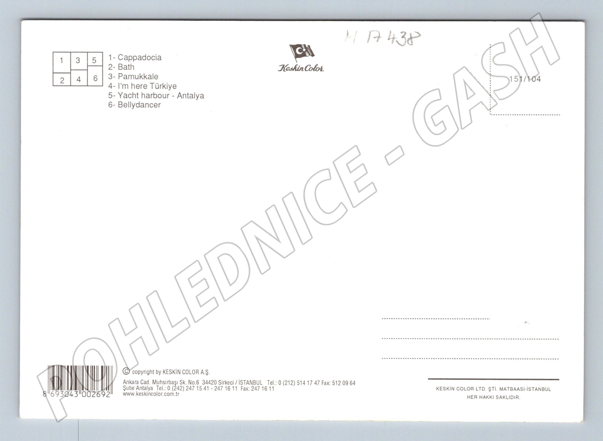 Originální víceobrázková barevná pohlednice z Turecka. Na přední straně jsou zachyceny známé turecké lokality a motivy: Kappadokie, Pamukkale, jachtařský přístav v Antalyi, turecké lázně (hamam) a břišní tanečnice. Uprostřed je mapa světa s textem I m here Türkiye . Zadní strana je nevyplněná, s popisem jednotlivých míst v angličtině. Jedná se o krásnou sběratelskou pohlednici vhodnou pro milovníky cestování a orientálních motivů. Pohlednice je neprošlá poštou, ve vynikajícím stavu, vydavatel Keskin Color.