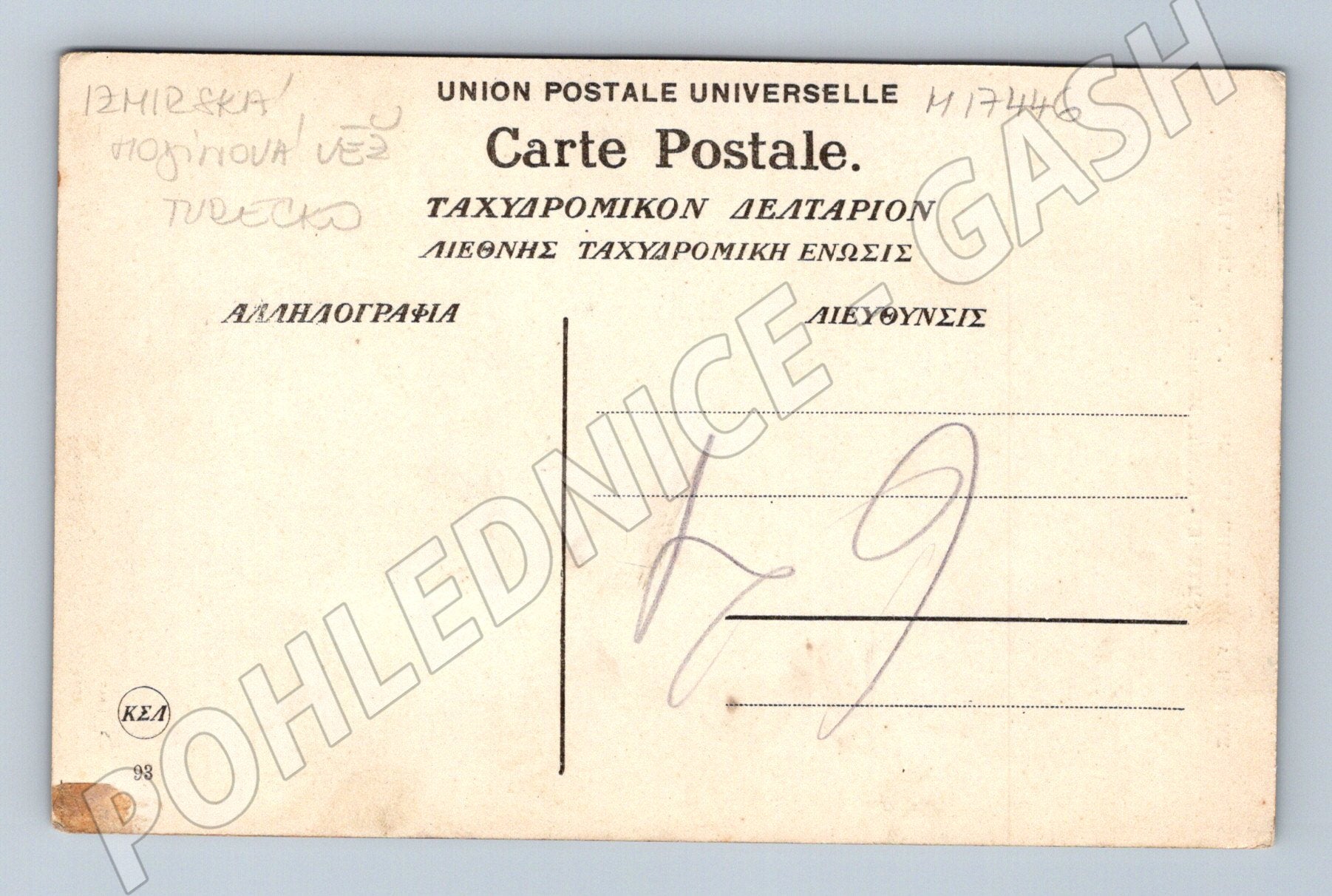 Originální stará pohlednice zobrazující slavnou hodinovou věž (Saat Kulesi) a monumentální fontánu v centru města Smyrna (dnes Izmir, Turecko). Pohlednice je ručně kolorovaná, s popisem ve francouzštině a řečtině (SMYRNE - Fontaine Monumentale). Jedná se o zajímavý historický pohled na významnou tureckou památku a centrum města, vhodné pro sběratele pohlednic nebo zájemce o historii Turecka a Orientu. Na zadní straně je univerzální formát Carte Postale a text v řečtině a francouzštině. Stav viz foto, mírné opotřebení dle stáří, bez vyplněné adresní strany.