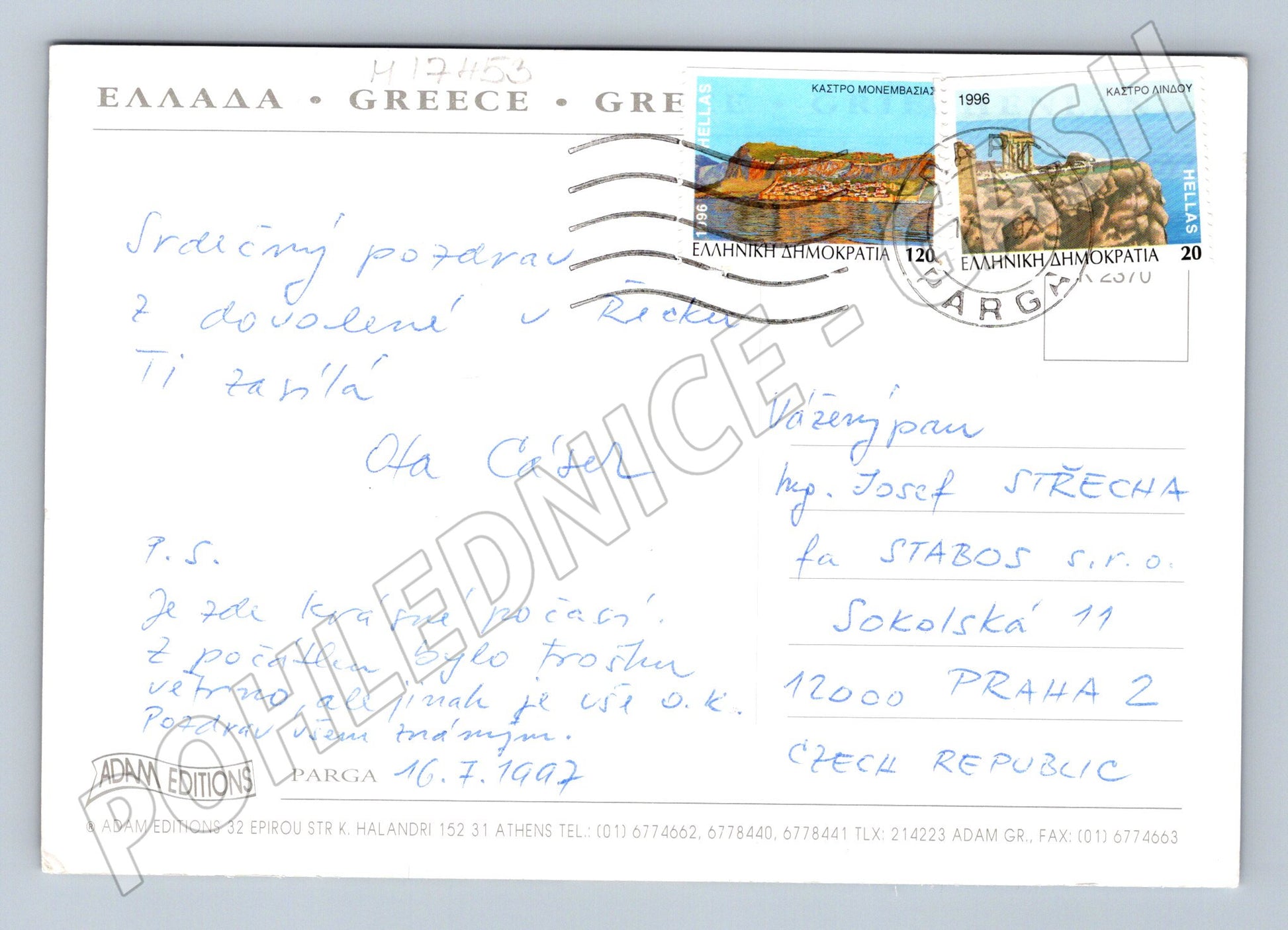 Nabízím originální pohlednici z řeckého městečka Parga. Na přední straně najdete krásnou leteckou fotografii pobřeží a města Parga s průzračným mořem, písčitými plážemi a typickými středomořskými domky. Zadní strana je popsána a obsahuje razítko a řecké známky z roku 1996 (Kastro Monemvasia a Kastro Lindou). Jedná se o skvělý sběratelský kousek z oblasti Řecka, vhodný i jako suvenýr nebo vzpomínka na dovolenou ve Středomoří. Stáří pohlednice dokládá datum 16.7.1997. Pohlednice je ve velmi dobrém sběratelském stavu.