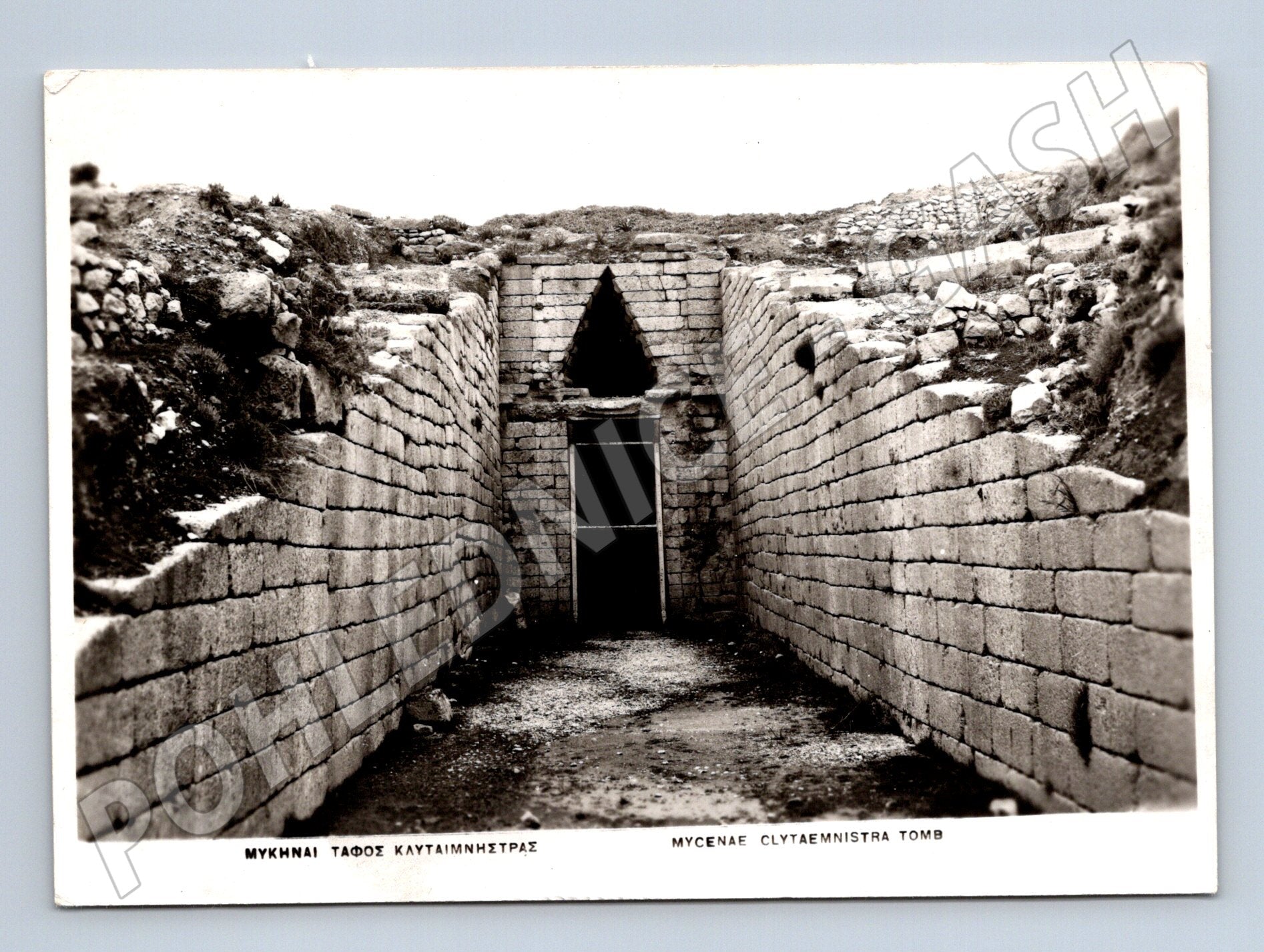 Originální černobílá pohlednice zobrazující slavnou Královskou hrobku Klytaimnéstry v Mykénách, Řecko. Na přední straně je hlavní vstup do monumentální hrobky, která pochází z období mykénské civilizace. Zadní strana je neodoslaná, s popisem ve čtyřech jazycích (řecky, francouzsky, anglicky, německy). Skvělý sběratelský kousek či dárek pro milovníky antické historie a archeologie. Stav pohlednice je velmi dobrý, bez známek používání.