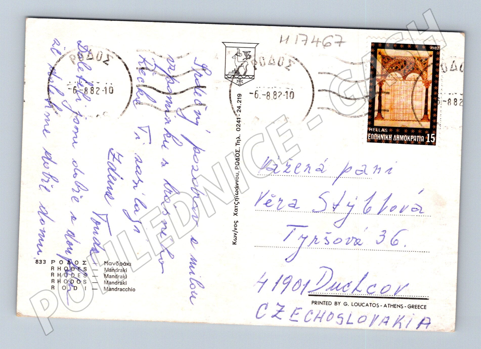Pohlednice Rhodos Mandraki přístav 1982, zaslaná do ČSSR