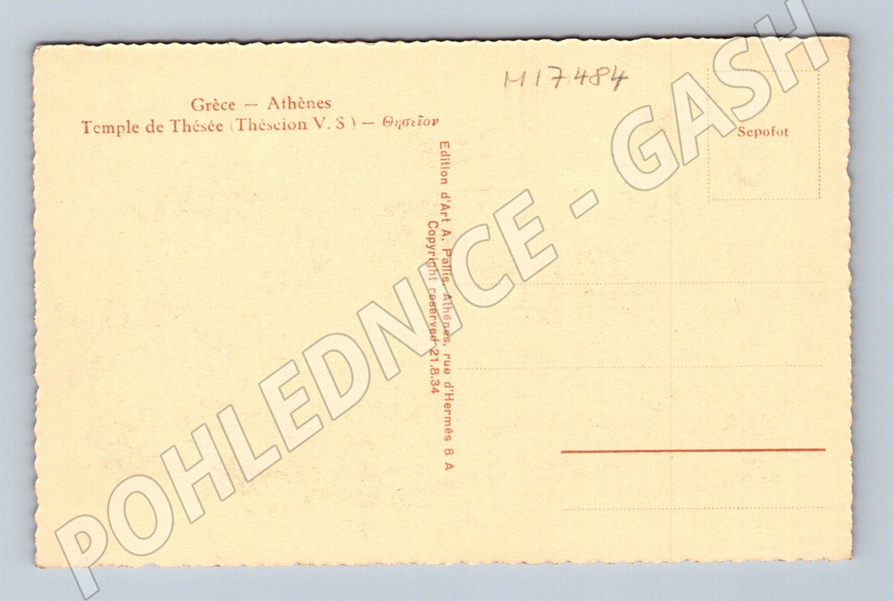 Originální stará pohlednice zachycující slavný antický chrám Theseion (Théseion) v Athénách, Řecko. Chrám patří mezi nejlépe dochované antické stavby a je příkladem klasické řecké architektury. Na pohlednici je detailně vyobrazen samotný chrám, na zadní straně pak popis v několika jazycích a místo pro známku a adresu. Okraje pohlednice jsou vlnkované, pohlednice nebyla použita, je ve velmi dobrém sběratelském stavu. Skvělý doplněk do sbírky historických pohlednic nebo suvenýrů z Řecka.