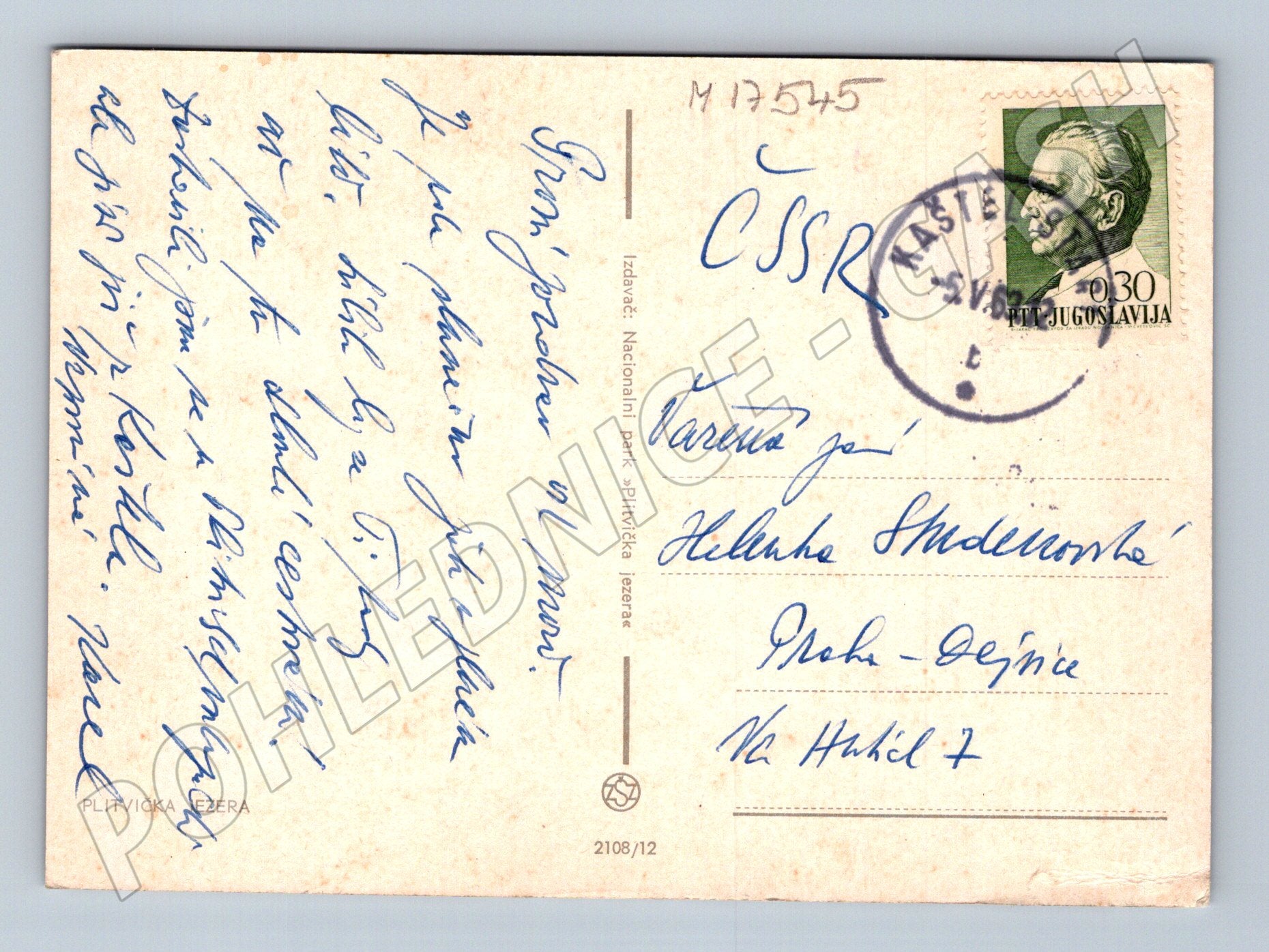 Originální barevná pohlednice ze 70. let z oblasti Plitvická jezera v bývalé Jugoslávii (dnešní Chorvatsko). Pohlednice zobrazuje slavné vodopády národního parku Plitvická jezera, který je zapsaný na seznamu UNESCO. Na zadní straně je ručně psaný vzkaz, poštovní razítko z Kaštela z roku 1974 a jugoslávská známka s portrétem. Výborný sběratelský stav s drobnými známkami stáří, bez výrazných poškození. Skvělý historický artefakt pro sběratele pohlednic z bývalé Jugoslávie nebo milovníky přírody a cestování.