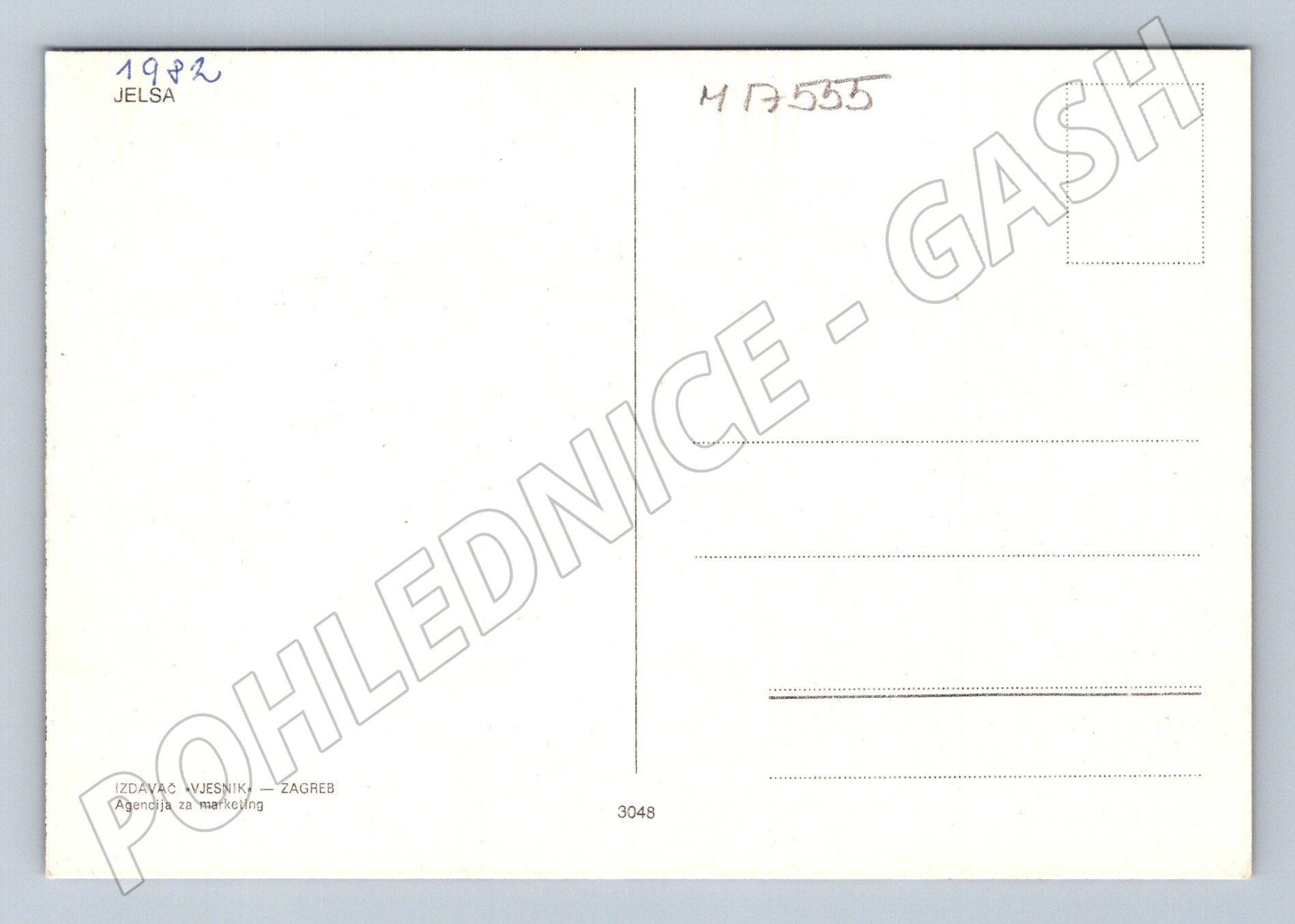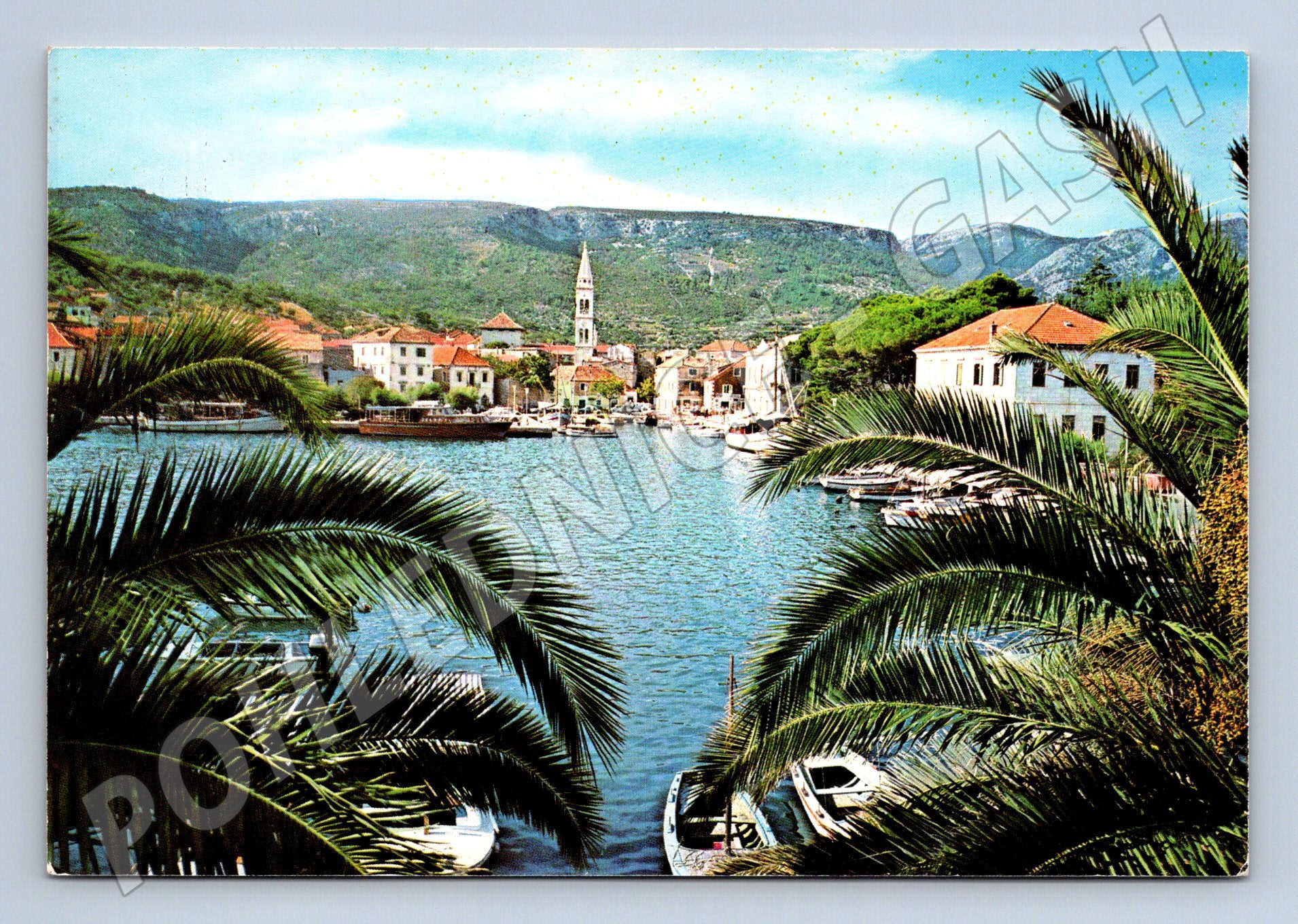 Pohlednice Jelsa – pohled na malebné přístavní městečko na chorvatském ostrově Hvar. Celkový pohled přes palmy na přístav, kde kotví malé lodě, s typickou středomořskou architekturou domů a kostelem v pozadí. Pohlednice je neprošlá, v dobrém stavu, čistá zadní strana s označením vydavatele Vjesnik, Záhřeb a letopočtem 1982. Ideální pro sběratele nebo jako suvenýr pro milovníky Chorvatska a Jadranu.