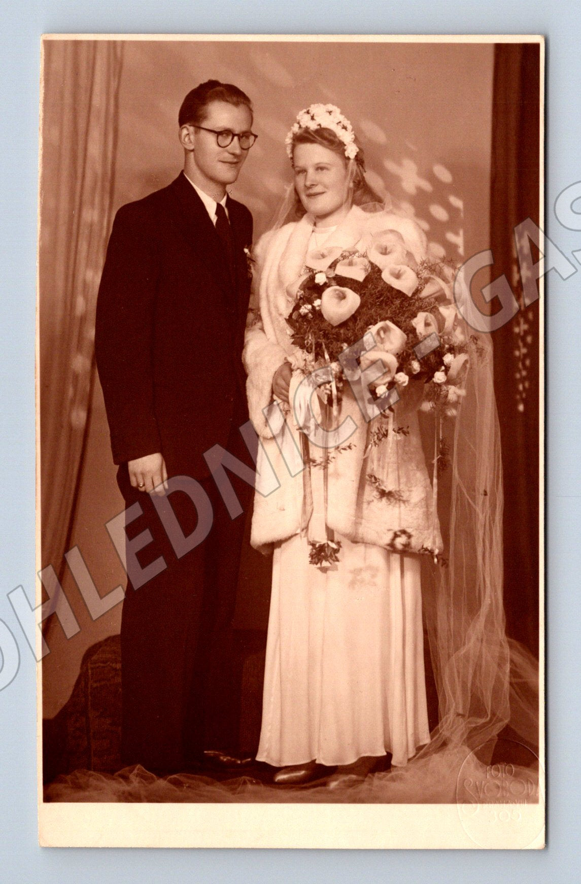 Nabízím originální starou svatební pohlednici. Na obrázku je mladý pár ve svatebním oblečení. Nevěsta drží bohatou kytici a oba pózují v ateliéru. Pohlednice je neprošlá, na zadní straně je standardní rozvržení pro adresu a zprávu, vlevo dole je značka vydavatele Voglklinder . Jedná se o černobílou fotografii, pravděpodobně z první poloviny 20. století. Pohlednice je v dobrém stavu, bez výrazného poškození, pouze drobné známky stáří. Skvělý sběratelský kousek pro milovníky starých fotografií a rodinných vzpomínek.