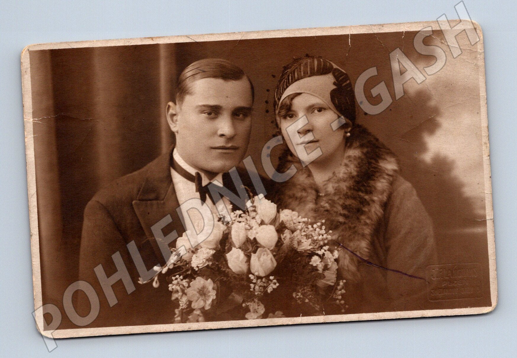 Stará svatební pohlednice – manželé Maškovic, 1. pol. 20. stol.