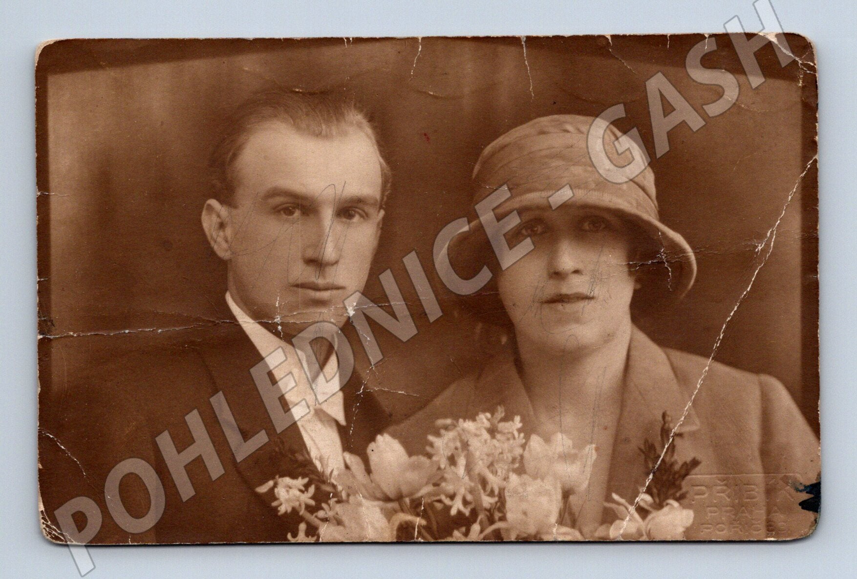 Originální stará pohlednice s portrétem muže a ženy z období první poloviny 20. století. Pohlednice je v hnědých tónech, zachycující dvojici elegantně oblečených osob, žena s kloboukem a muž v obleku, oba s květinami v popředí. Ve spodním rohu je označení ateliéru Přibyl Praha Porše . Pohlednice nese známky stáří – ohyby, škrábance a stopy opotřebení, zadní strana je popsána a pokreslena čmáranicemi. Vhodné jako sběratelský kousek, nebo ke studiu dobové módy a portrétní fotografie.