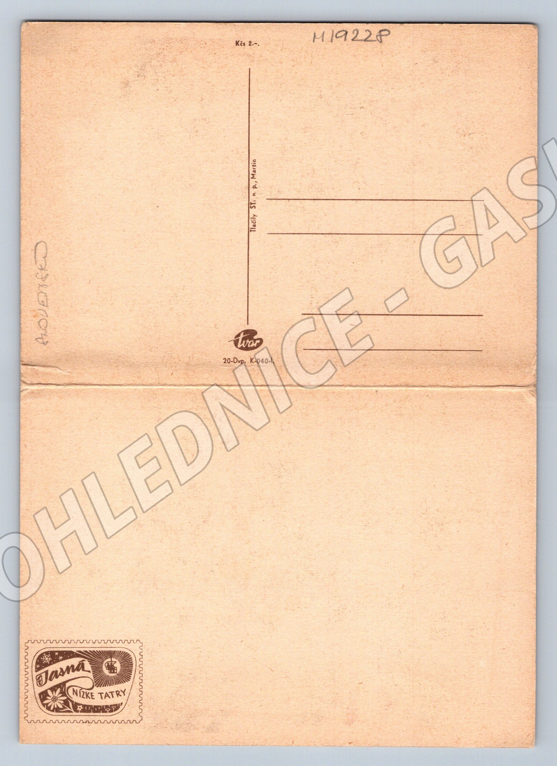 Originální historická pohlednice s ručně kreslenou mapou oblasti Nízkých Tater na Slovensku. Na pohlednici jsou stylizovaně vyznačeny horské vrcholy, turistické trasy, chaty a přírodní zajímavosti této oblasti. Pohlednice má krásné barevné provedení a na přední straně detailní ilustrace s názvy jednotlivých míst. Zadní strana je nepopsaná, s předtištěnou adresní částí. Pohlednice je určena sběratelům, milovníkům historie i turistiky a představuje atraktivní pohled na Nízké Tatry tak, jak byly vnímány ve 20. století. Stav odpovídá stáří, viz foto. Skvělý doplněk do každé sbírky slovenských pohlednic!