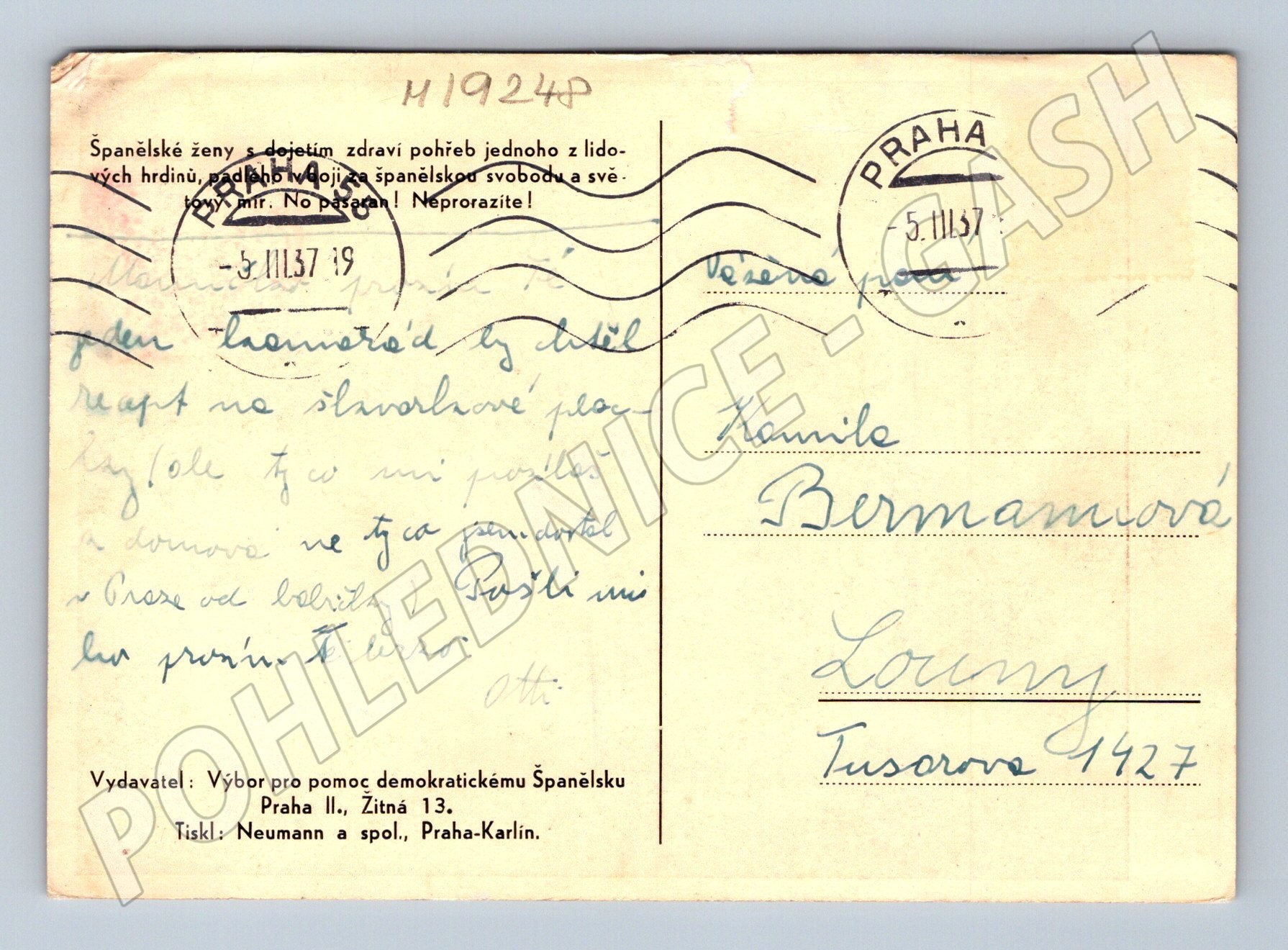 Nabízím originální pohlednici z meziválečného období, konkrétně z roku 1937. Pohlednice byla vydána Výborem pro pomoc demokratickému Španělsku, Praha II., Žitná 13, tisk Neumann a spol., Praha-Karlín. Na přední straně je silný emotivní černobílý snímek španělské ženy s dítětem, symbolizující utrpení civilního obyvatelstva během španělské občanské války. Text na zadní straně uvádí: Španělské ženy s dojetím zdraví pohřeb jednoho z lidových hrdinů, padlých v boji za svobodu a svůj mír. No pasarán! Neprorazíte! . Na zadní straně je ručně psaný vzkaz, poštovní známka s razítkem PRAHA - 5.11.1937 a adresováno do Loun. Vzácný historický kousek s jasnou ideologickou a humanitární tematikou, vhodný pro sběratele, zájemce o historii či španělskou občanskou válku.