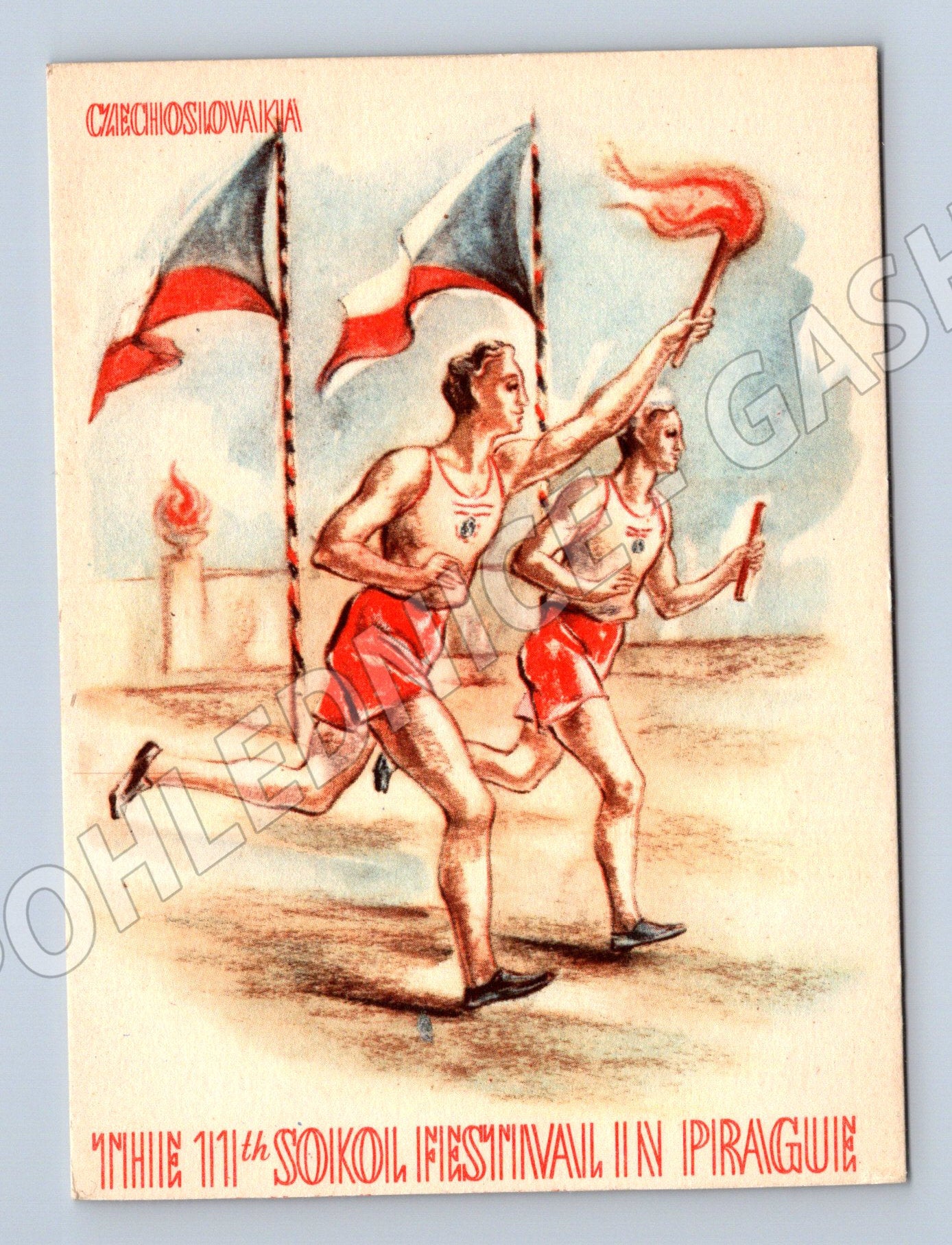 Originální pohlednice z období Československa, vydaná u příležitosti XI. všesokolského sletu v Praze. Pohlednice zachycuje běžce v typických sokolských úborech s československými vlajkami a hořící pochodní. Ilustrace je provedena jemnou kresbou a akvarelem. Na přední straně je anglický popis: 11th Sokol Festival in Prague. Pohlednice je ve velmi dobrém stavu, čistá a nepopsaná, vhodná pro sběratele historických pohlednic nebo zájemce o sokolskou tematiku. Formát menší než A6, původní výroba, na zadní straně značka a číselné označení. Perfektní kousek do sbírky!