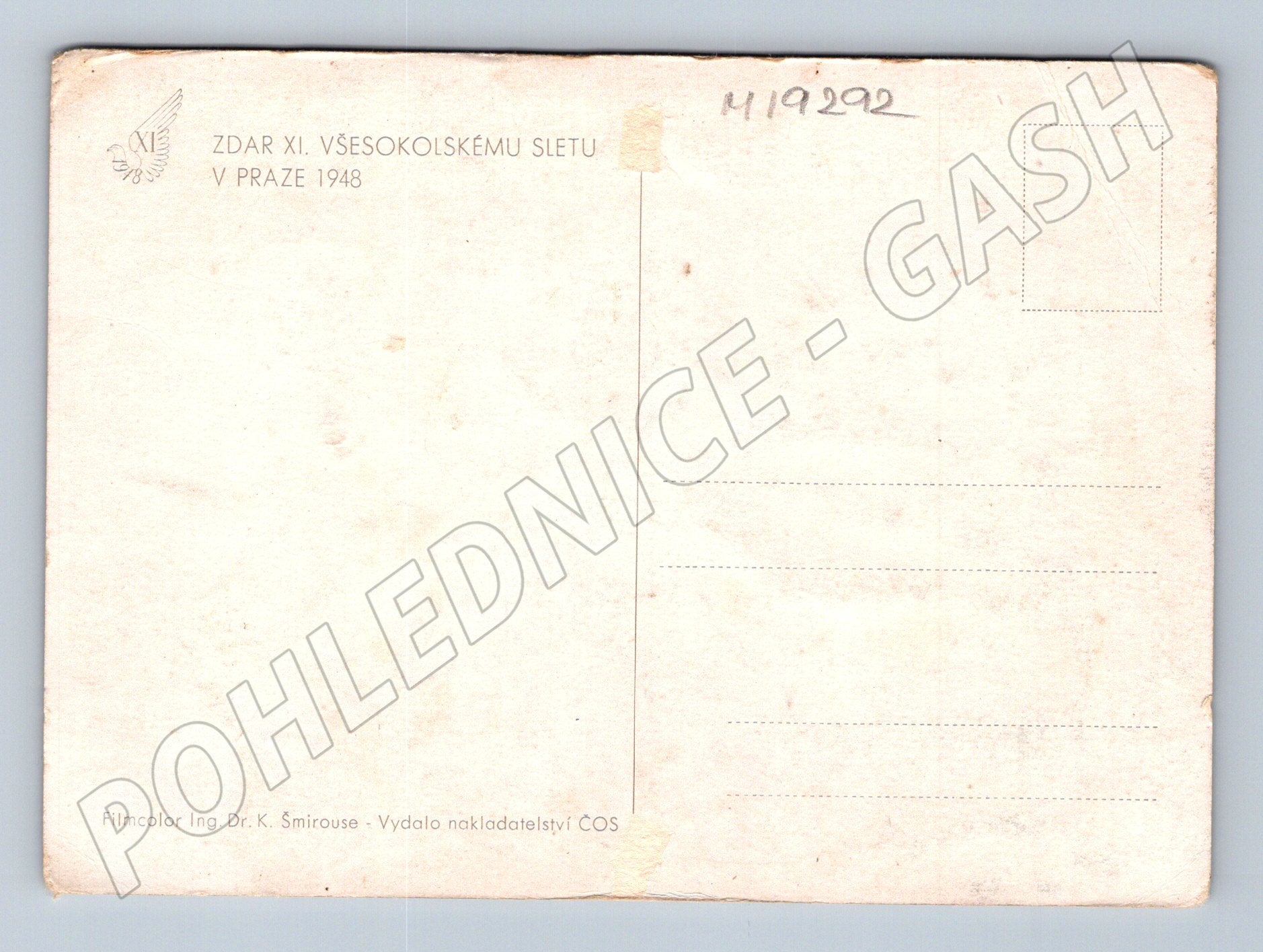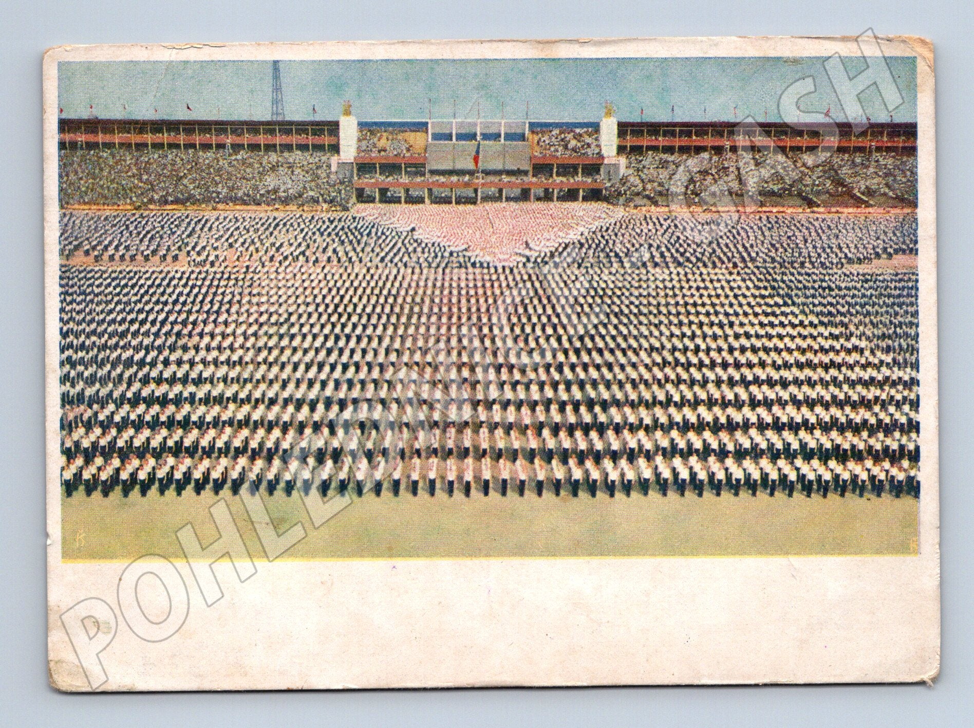 Historická pohlednice zachycující XI. všesokolský slet v Praze roku 1948. Na pohlednici je vyobrazen slavnostní nástup cvičenců na stadionu za účasti tisíců sokolů v typických řadách. Pohlednice je tištěna technikou filmcolor, vydalo nakladatelství Československé obce sokolské (ČOS), Filmcolor Ing. Dr. K. Šmirouse. Na zadní straně nápis: Zdar XI. všesokolskému sletu v Praze 1948 . Jedná se o autentický kousek do sbírky milovníků české historie, sportovních slavností nebo Sokolstva. Stav odpovídá stáří a běžnému použití – viz foto.