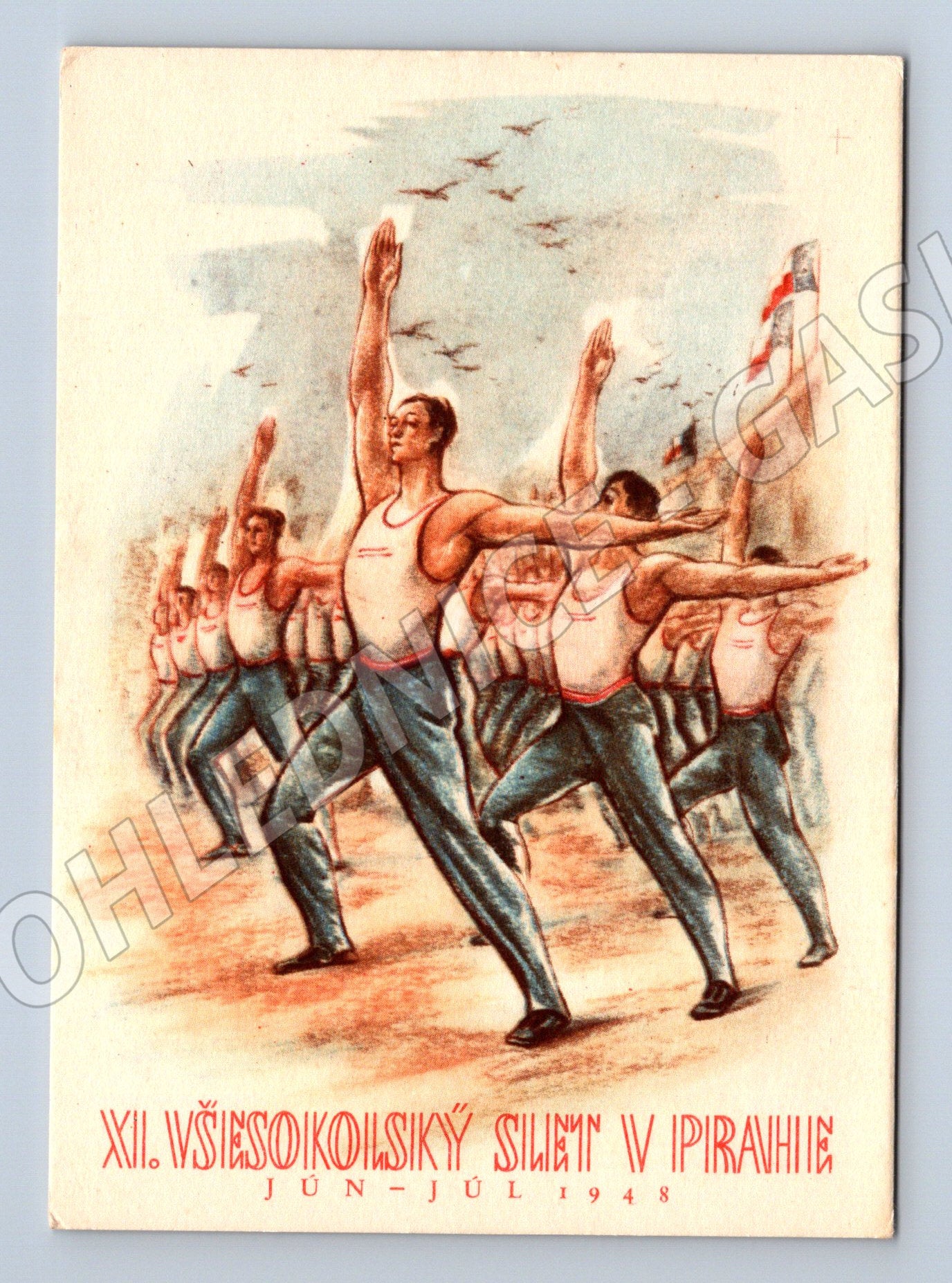 Originální pohlednice z roku 1948, vydaná u příležitosti XII. všesokolského sletu v Praze. Na pohlednici je stylizovaná kresba skupiny cvičících sokolů při hromadné akci na pozadí panoramatu Prahy (včetně siluety Pražského hradu a českých vlajek). Pohlednice nebyla použita (bez textu a známky), je v hezkém sběratelském stavu, s malými stopami stáří dle fotografií. Skvělý doplněk do sbírky sokolských či historických pohlednic z období první republiky a krátce po ní.
