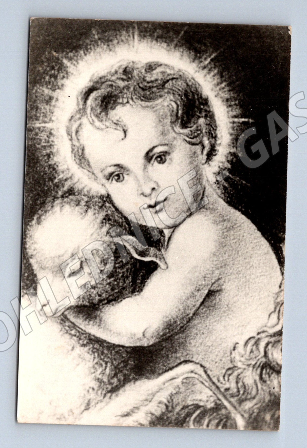 Originální pohlednice z období první poloviny 20. století, zaslaná v roce 1945 (dle razítka a známky). Pohlednice je ve formátu malý formát, přední strana zdobená černobílou ilustrací Jezulátka s jehňátkem, typická pro vánoční či sváteční motivy. Zadní strana je popsána, včetně adresy a dochované dobové známky z ČSR. Vhodné pro sběratele historických pohlednic a milovníky vánočních témat. Stav odpovídá stáří - viz foto.