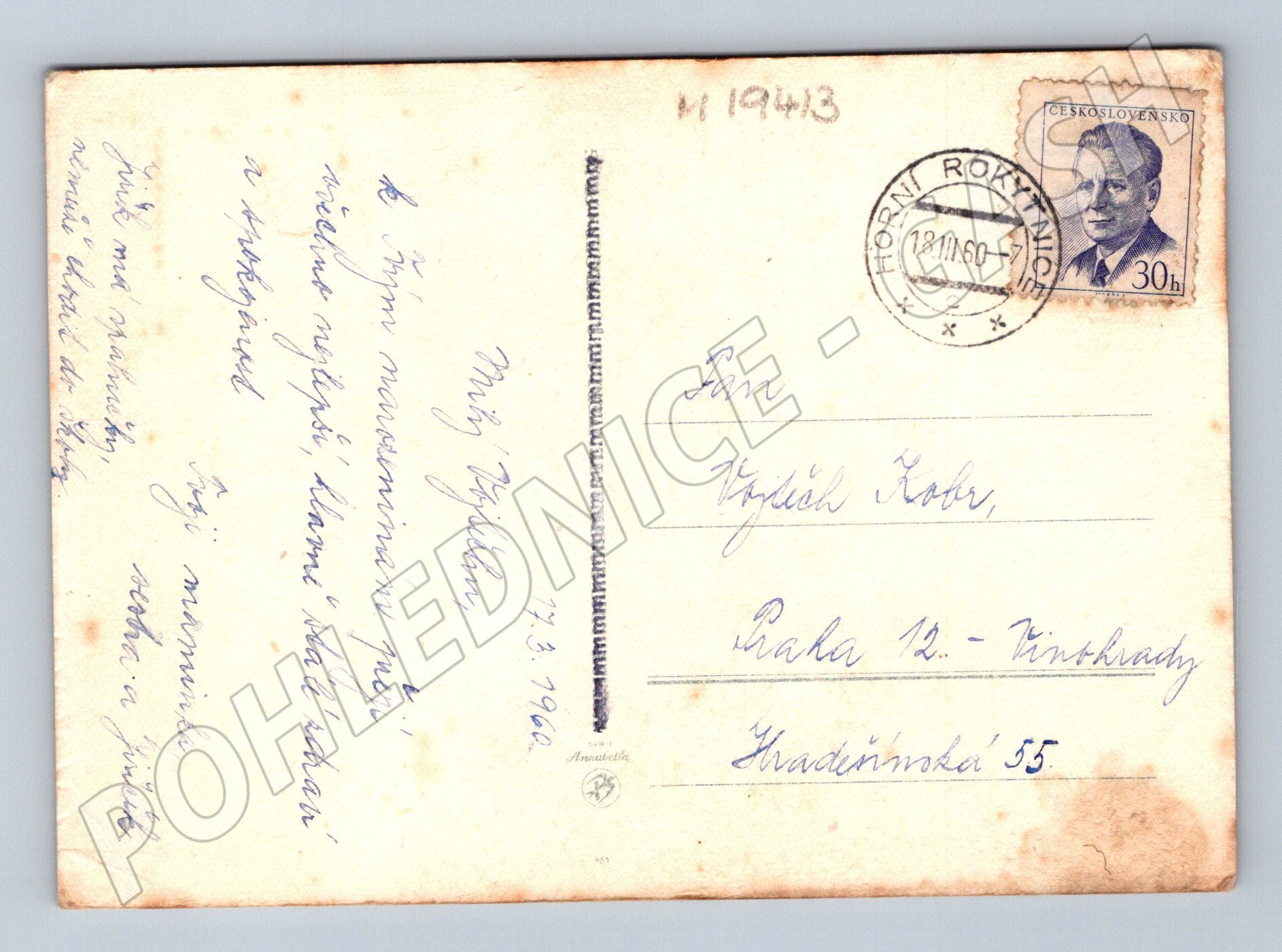 Starší pohlednice s krásným botanickým motivem květiny – modré pomněnky. Na přední straně je jemně ilustrovaný květ, zadní strana obsahuje ručně psaný text, poštovní známku s portrétem a razítko Horní Rokytnice s datem 18.III.60. Pohlednice byla zaslána do Prahy. Celkový stav je velmi pěkný, na okrajích jemné známky stáří a lehké zašpinění. Ideální k doplnění sbírky historických pohlednic z ČR, sběratelům i milovníkům botanických motivů.