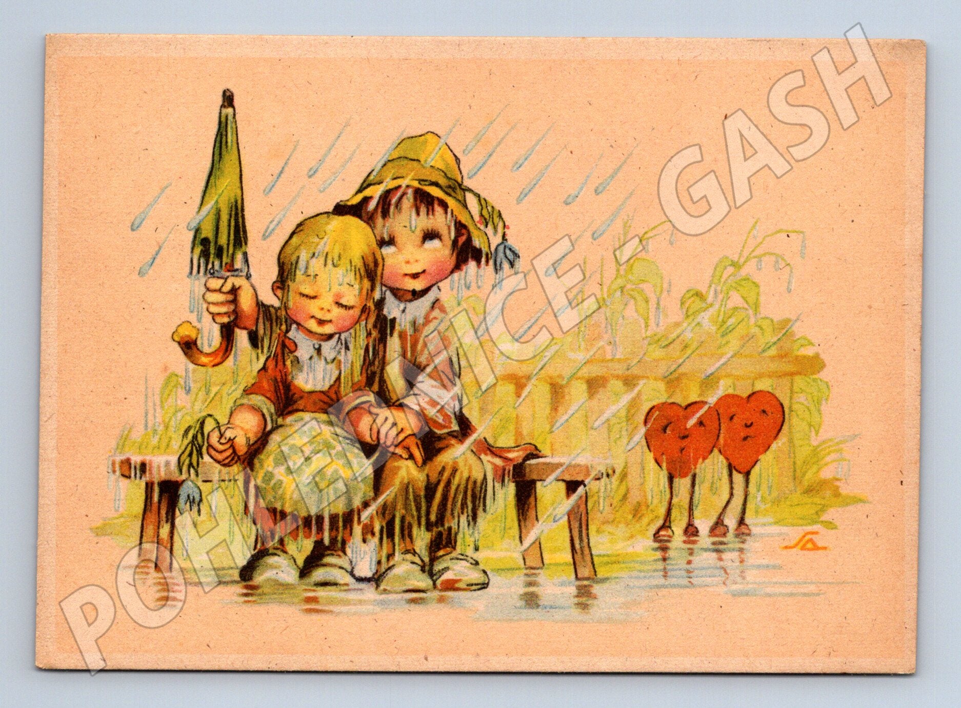Nabízím k prodeji starou pohlednici s malovaným motivem dvou dětí sedících na lavičce v dešti. Jedno dítě drží deštník nad oběma, zatímco kolem nich prší. V pozadí je plot a dvě roztomilá srdíčka s úsměvem, která zdůrazňují laskavou a veselou atmosféru pohlednice. Pohlednice je neprošlá, zadní strana je čistá s možností napsání adresy a vzkazu. Ideální pro sběratele, milovníky malovaných pohlednic či jako nostalgický dárek.
