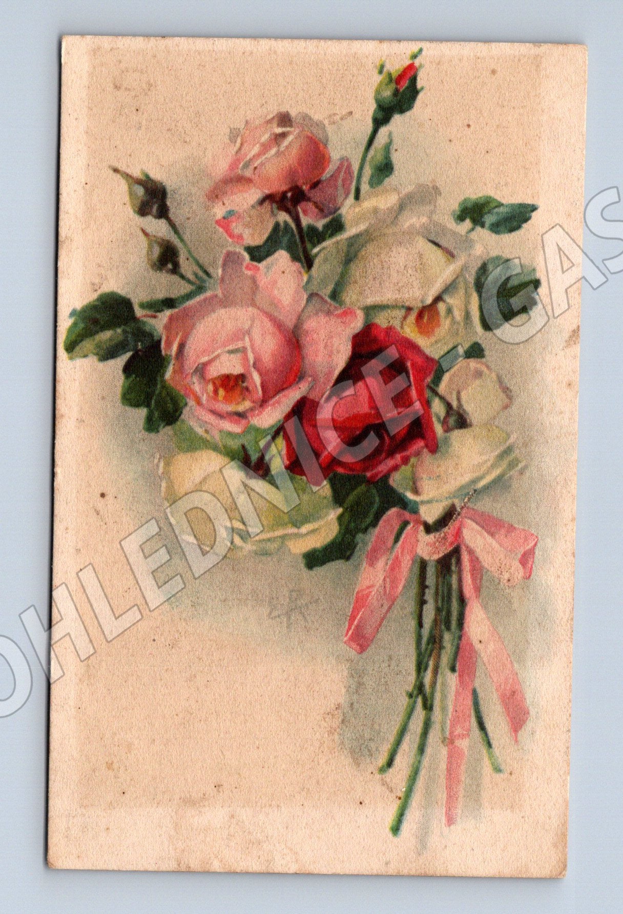 Stará pohlednice – květiny, růže se stuhou, nepopsaná