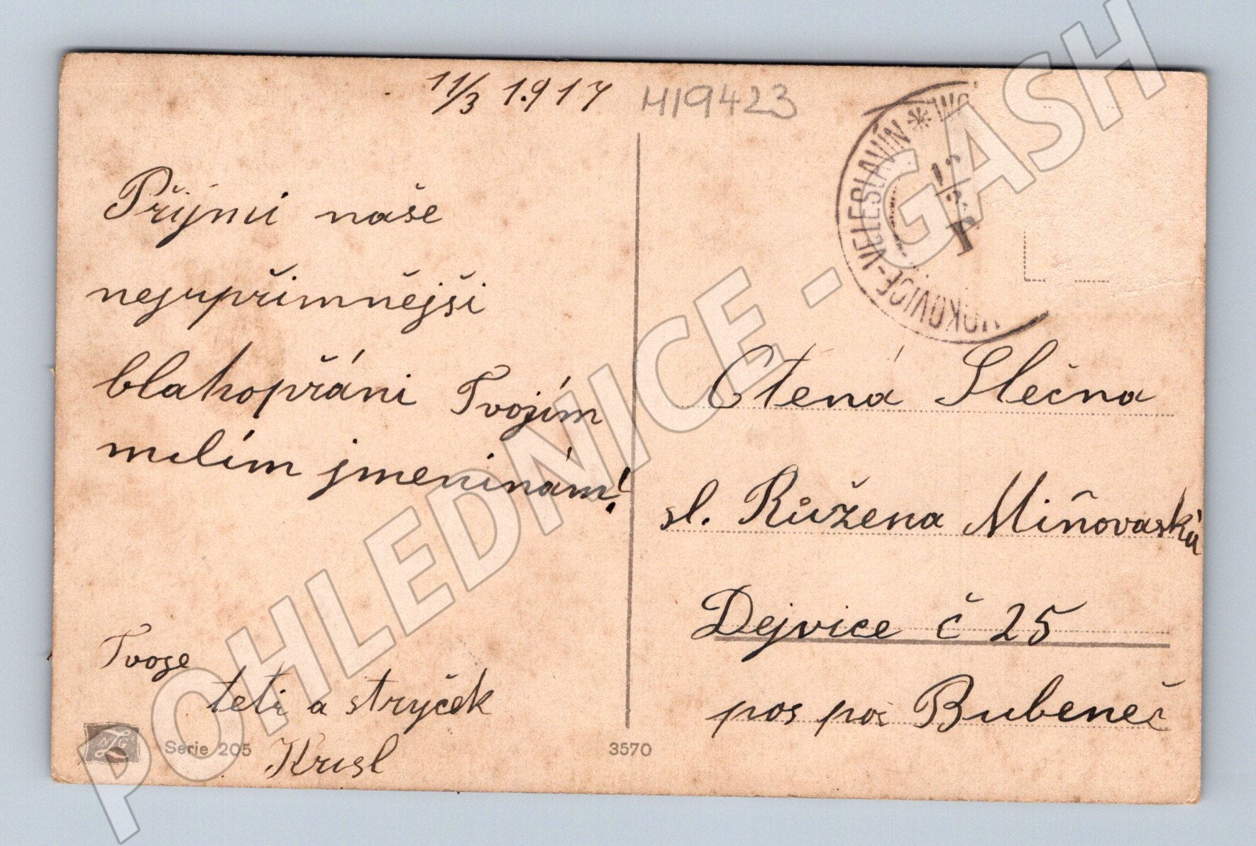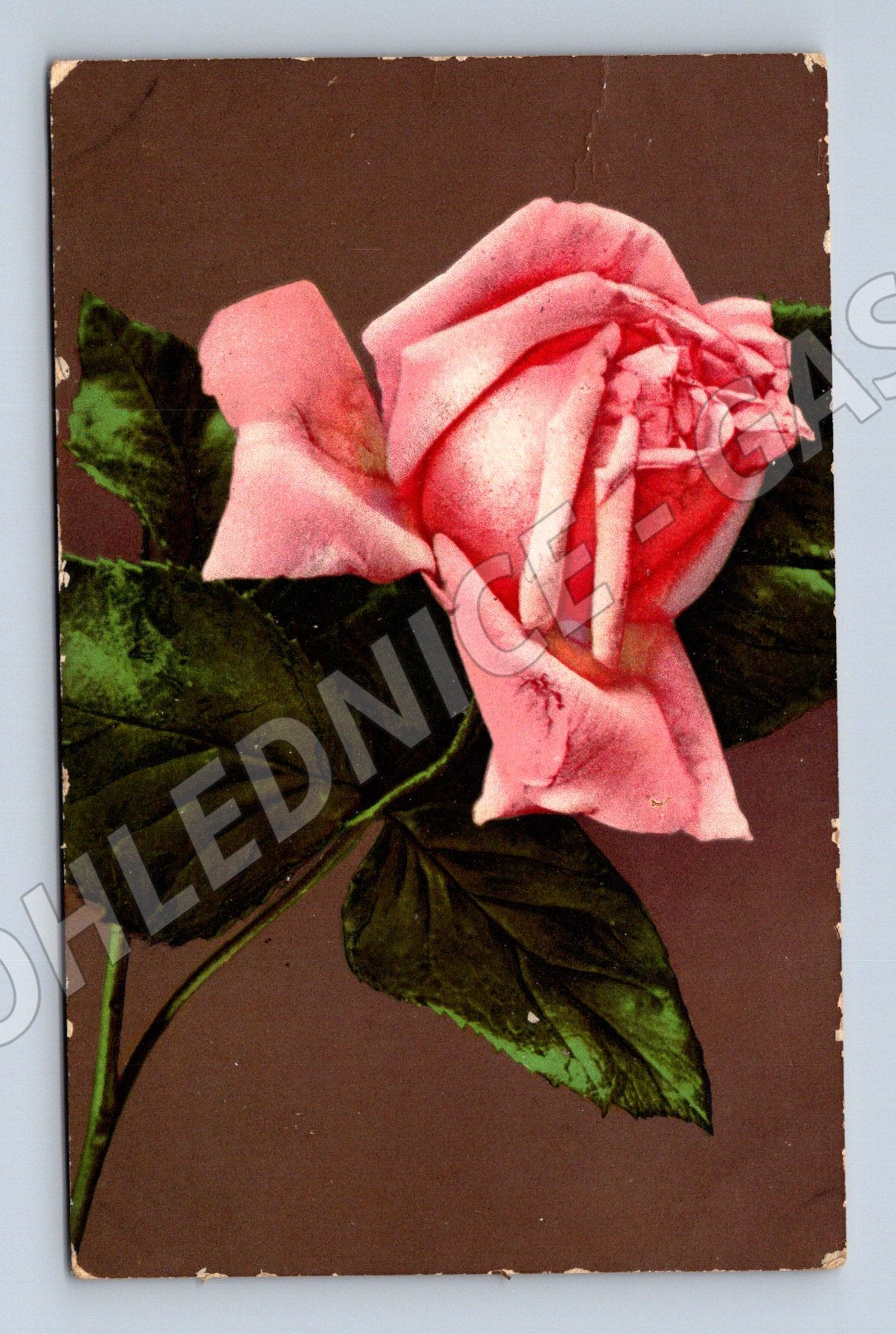 Tato originální pohlednice z roku 1917 představuje krásně ilustrovanou růžovou růži na přední straně. Na zadní straně je ručně psané blahopřání k jmeninám adresované slečně Růženě Minovské v Dejvicích. Pohlednice byla odeslána z Veleslavína, potvrzeno dochovaným poštovním razítkem. Rozměry odpovídají menšímu formátu historických pohlednic. Pohlednice nese stopy stáří a používání – drobné oděrky na okrajích a patina na zadní straně. Výjimečný sběratelský kousek z doby Rakouska-Uherska.
