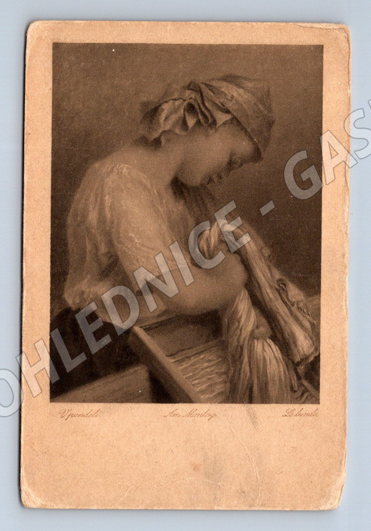 Originální stará pohlednice s reprodukcí obrazu od prof. V. Bukovace. Na přední straně je umělecké ztvárnění postavy dívky odpočívající s hlavou na ruce, tisk v hnědých tónech. Pohlednice je ve slušném stavu s mírným opotřebením okrajů odpovídajícím stáří. Na zadní straně je označení autora a vydavatele, dále číslo 521. Pohlednice je neprošlá poštou. Velmi pěkný sběratelský kousek z oboru malířství od významného autora.
