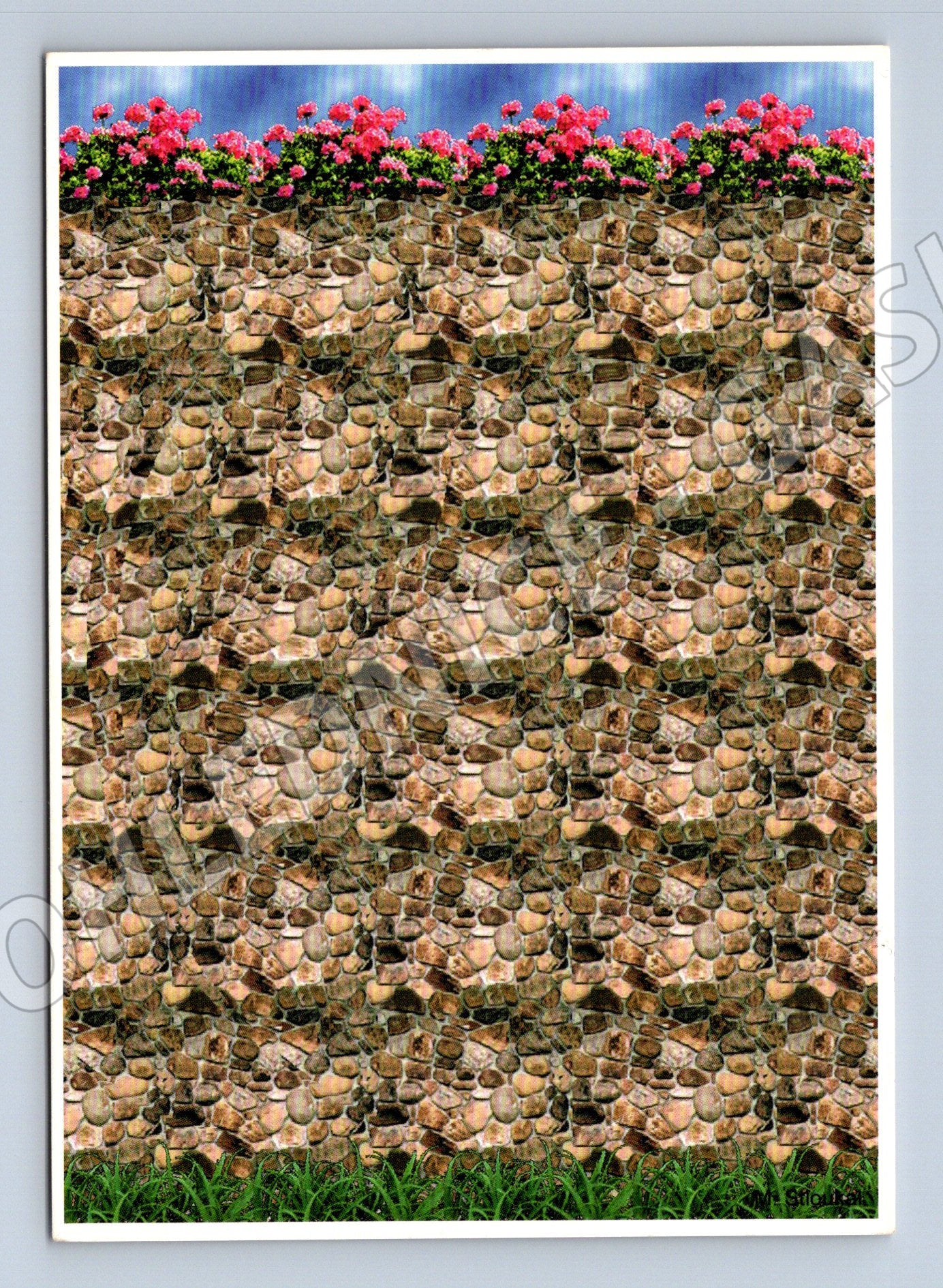 Originální stereogramová pohlednice s názvem Stěny mají uši vytvořená Studiem Holografie (2/94). Na lícové straně se nachází tzv. magický obrázek, který při správném pohledu odhalí skrytý trojrozměrný motiv. Na okrajích jsou zobrazeny květiny, kamenná zeď a tráva, v popředí tvoří hlavní motiv opakující se vzor kamenů. Pohlednice má klasický rozměr, zadní strana je nepopsaná. Vhodné pro sběratele netradičních pohlednic, zájemce o optické iluze a holografii. Česká republika, rok vydání 1994, velmi dobrý stav.