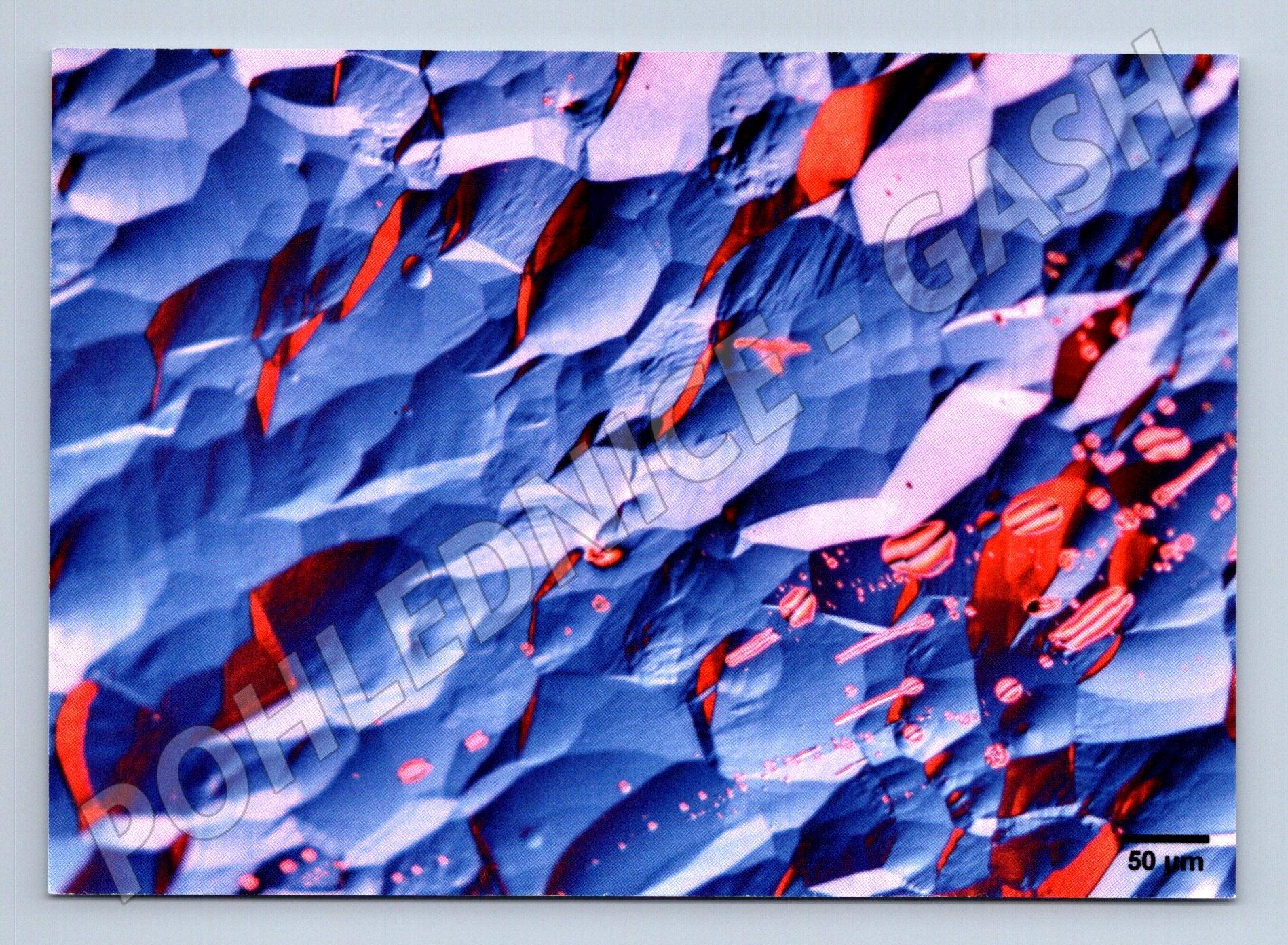 Originální vědecká pohlednice zobrazující povrch slitiny titanu po iontovém leštění. Obrázek vznikl pomocí světelné mikroskopie s Nomarského diferenčním interferenčním kontrastem, což vytváří unikátní barevnou strukturu povrchu v měřítku mikrometrů (měřítko v rohu: 50 μm). Pohlednice je vydána Katedrou fyziky materiálů MFF UK (matfyz). Ideální pro sběratele pohlednic s vědeckou a technickou tematikou nebo jako originální dárek pro nadšence do mikrosvěta materiálů. Nezapsaný stav, čistá, bez textu.